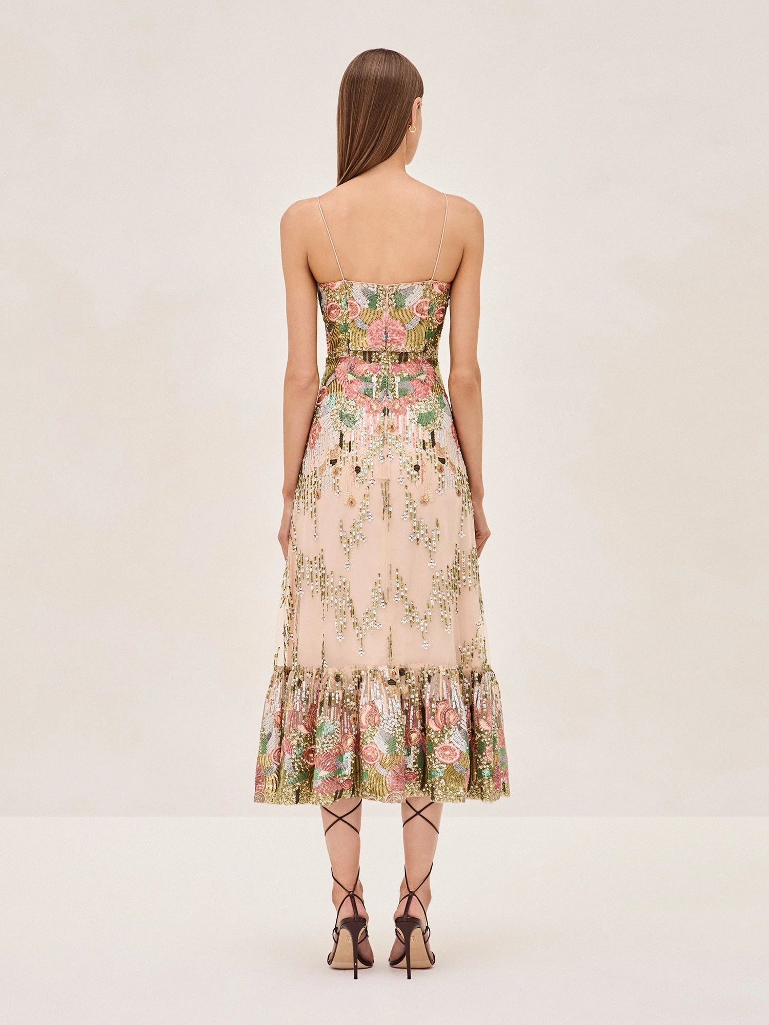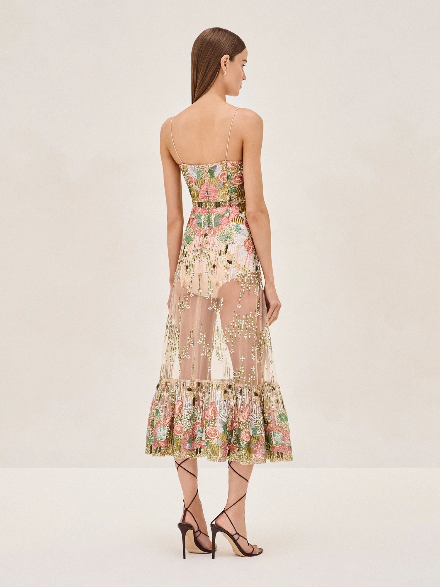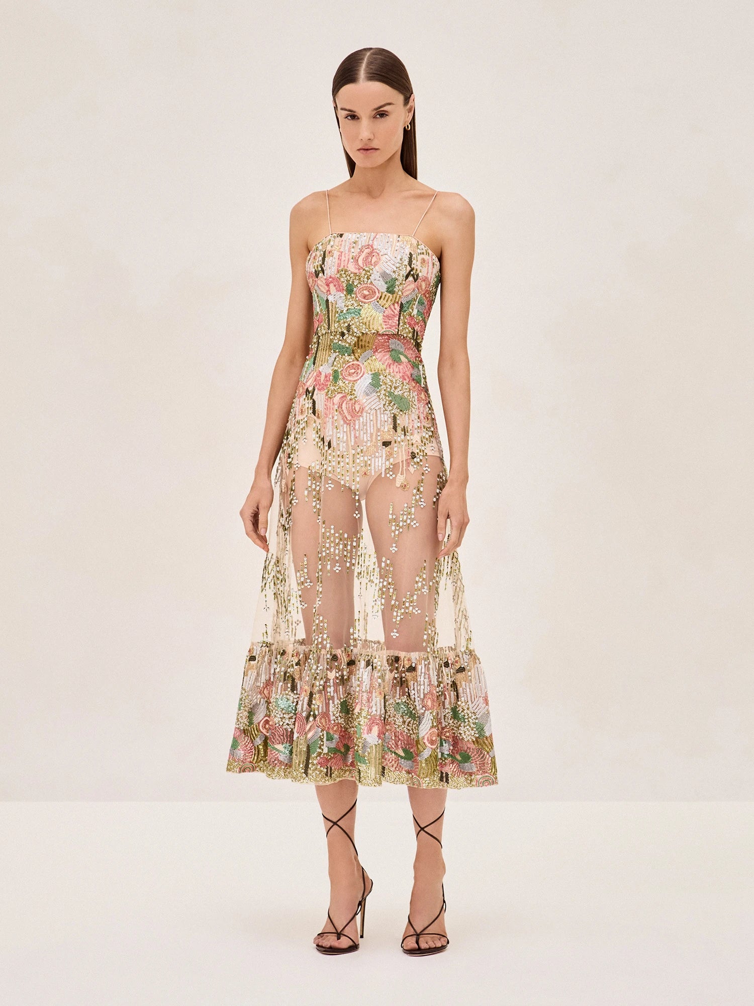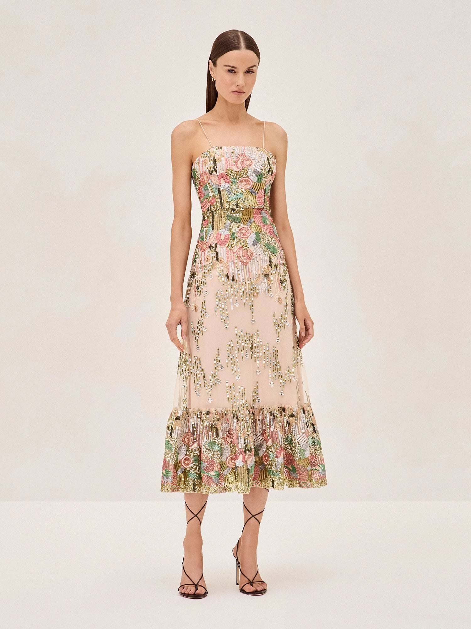 Introducing the Roseville Dress. With its stunning floral embroidery and shimmering sequins, this dress is designed to dazzle. Wear it with or without the removable skirt slip lining for added versatility.