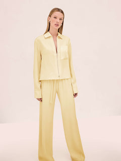 The Rowen Top is a zip-front collared design with a relaxed fit, paired with the Damian Pant.
