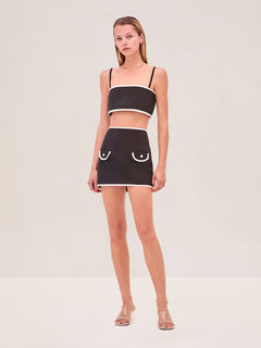 The Rubino Skirt is a crepe mini design featuring contrasting trim detail and structured pocket accents, paired with the Simi Top.
