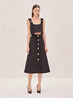 Upgrade your wardrobe with the Sinead Skirt - a high-waisted vegan suede beauty that boasts clean lines and bold gold buttons down the front. Designed to effortlessly elevate your look, this versatile skirt pairs perfectly with the Norie Top and can be easily mixed and matched with other pieces for a sleek and stylish day to night transition.