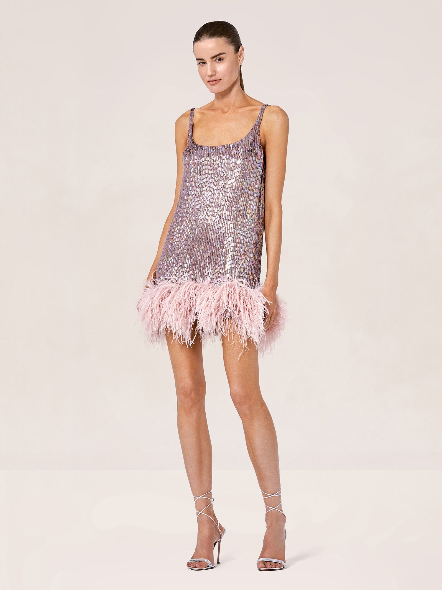 The Zaire dress will turn heads. The slinky scoop neck relaxed fit dress has a voluminous feather trim that will have you party ready. Keep your jewelry minimal and finish the look with strappy metallic sandals.
