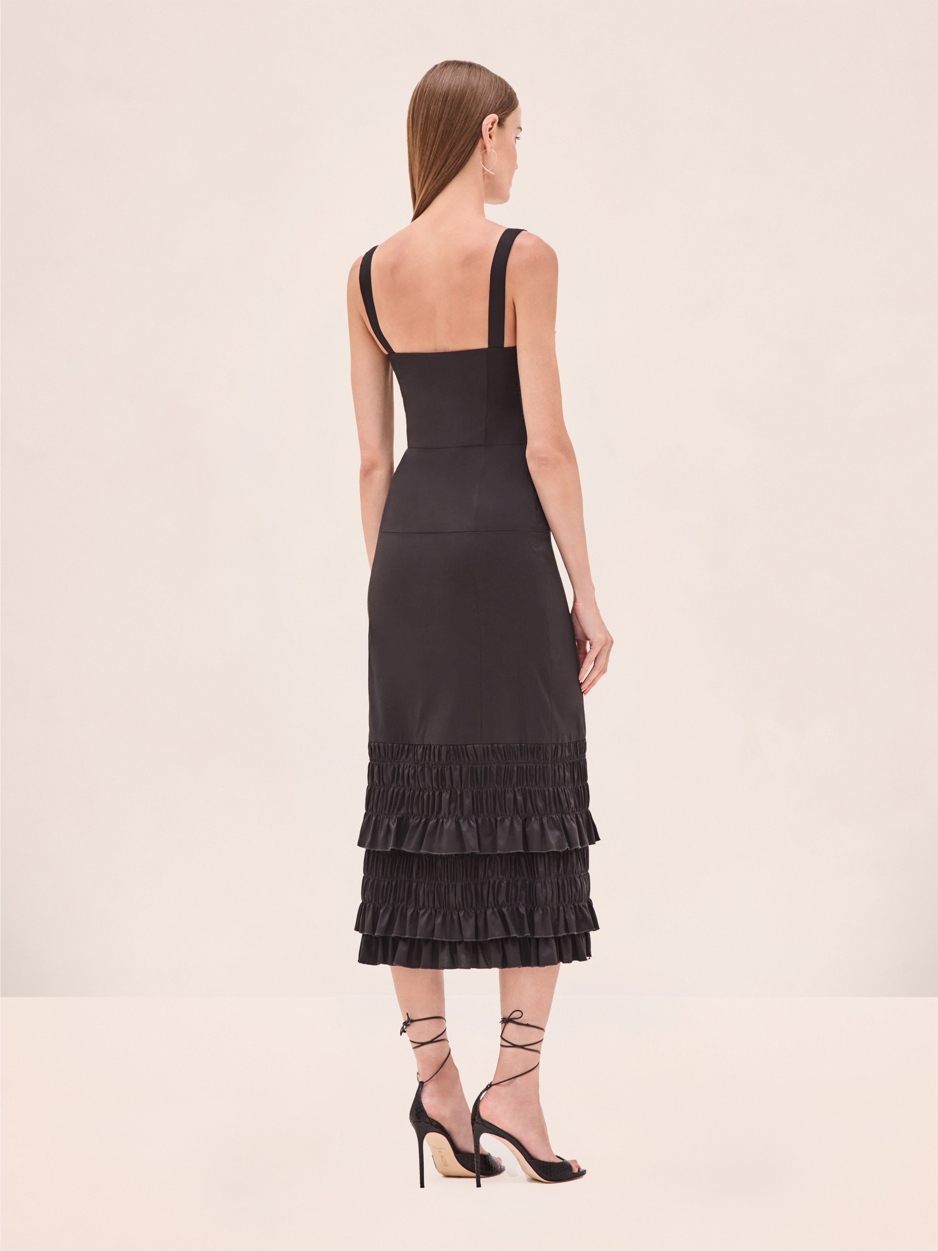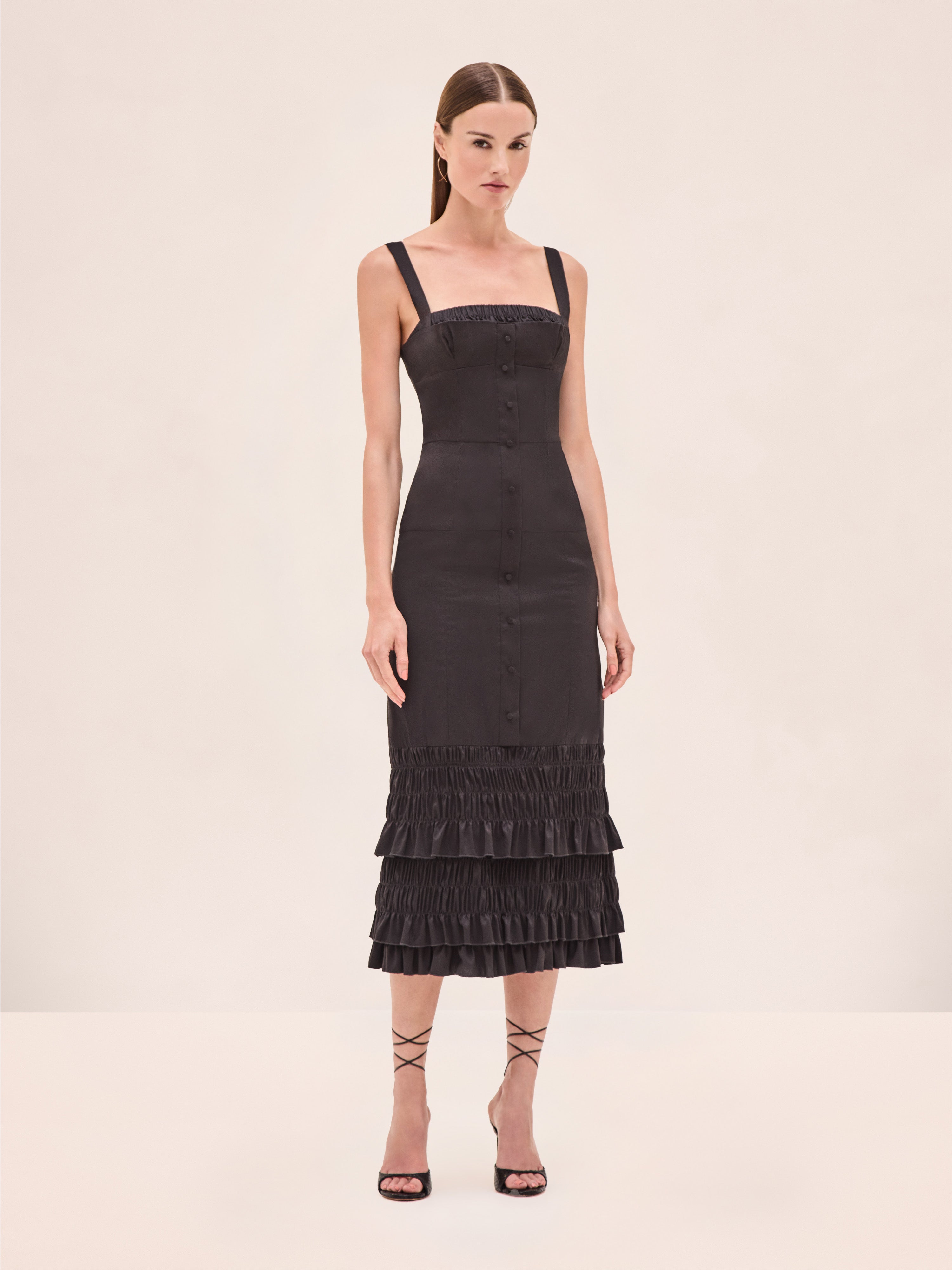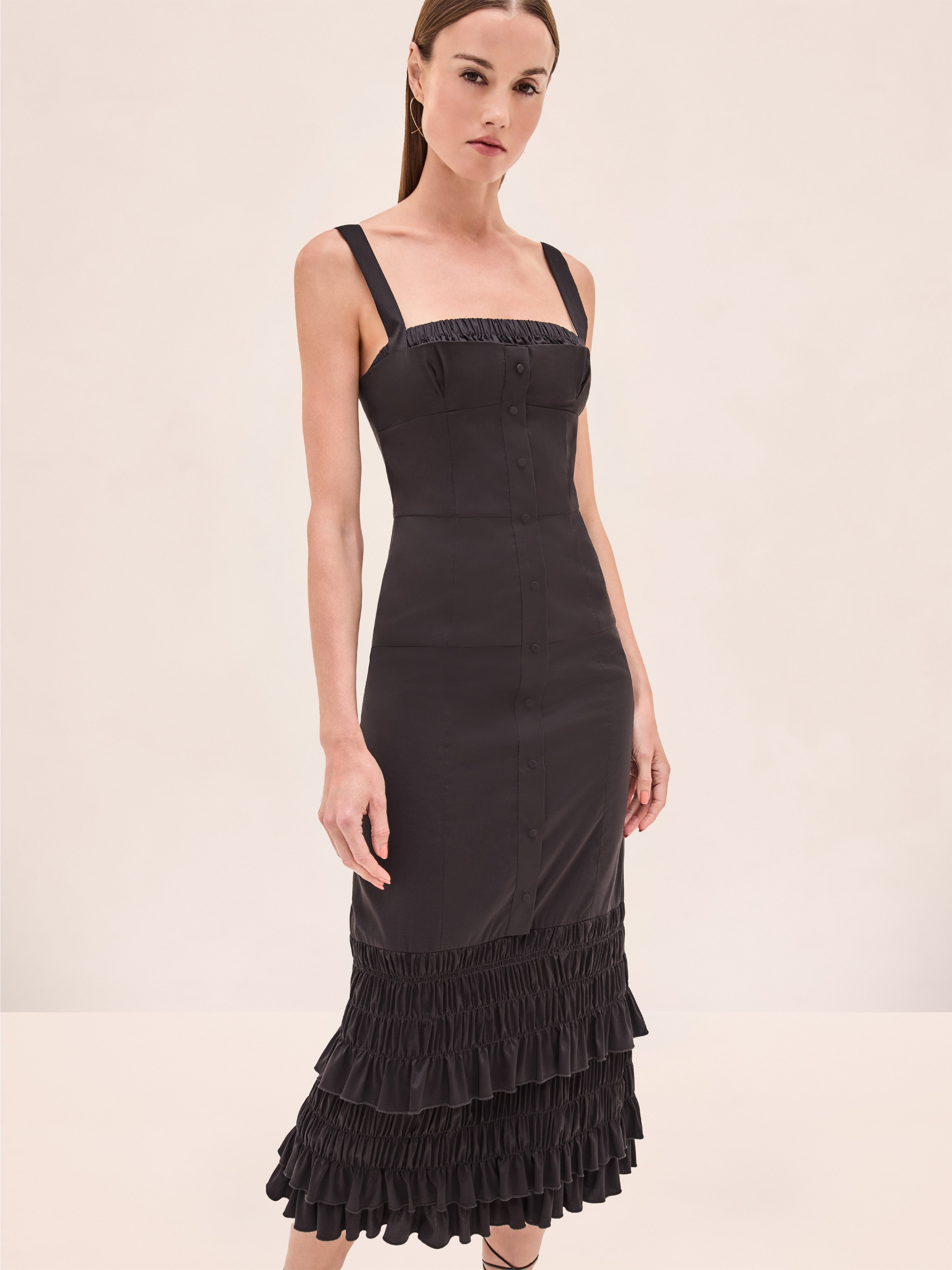 The Atalya Dress is a cotton poplin midi dress featuring scrunched ruffle detailing and a button-down front.