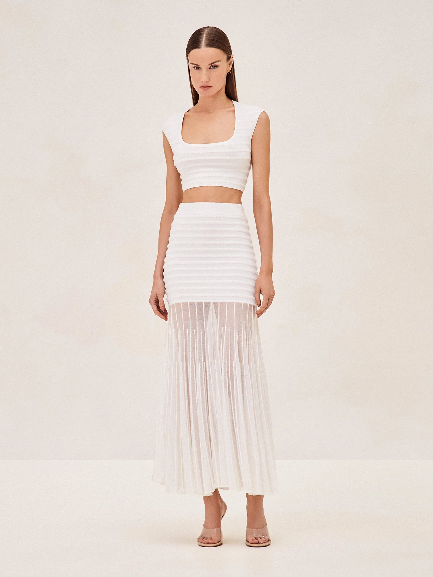 Introducing the Franki Skirt, the perfect combination of elegance and effortlessness. This white piece effortlessly blends a fitted form and airy pleats, resulting in a mesmerizing silhouette that flows with your every step. For a complete coordinated look, pair it with the Emille Top - perfect for seamlessly transitioning from day to night.