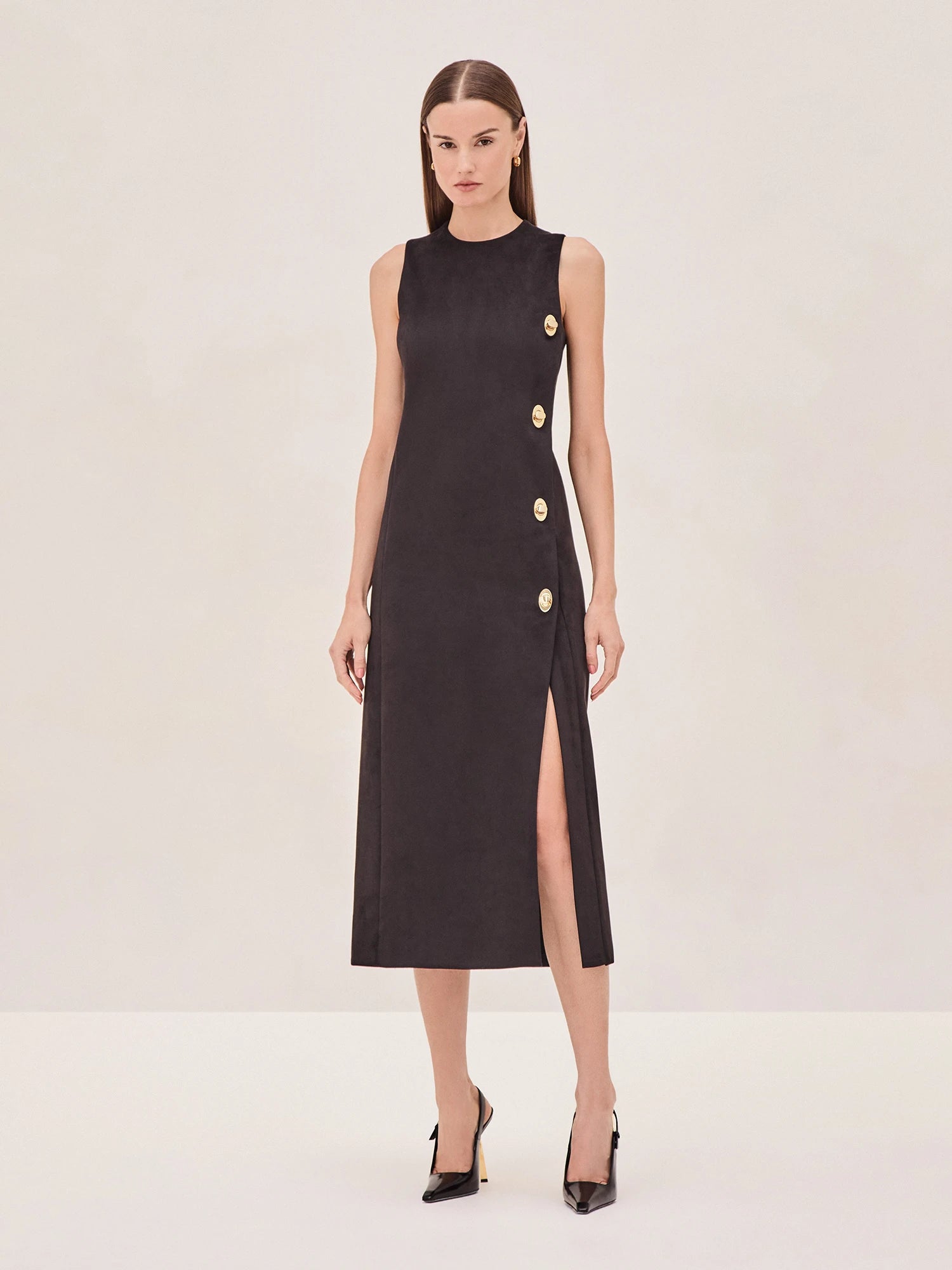 Meet the Kalita Vegan Suede Midi Dress – a modern minimalist’s dream. Crafted in luxe vegan suede, this dress effortlessly combines structure and softness. The sleek silhouette is elevated with gold-tone buttons along the side, offering just the right amount of edge with its slit.
