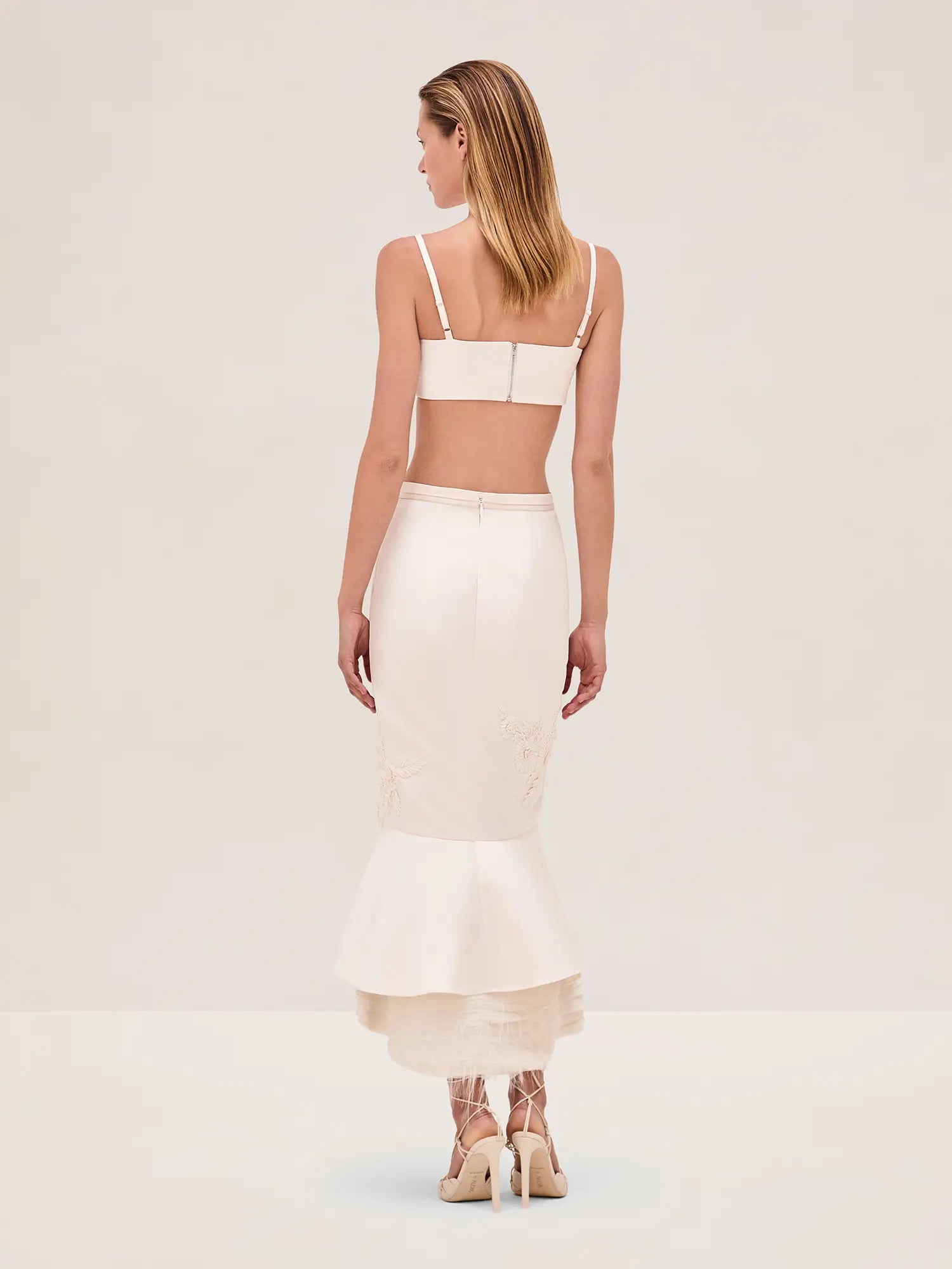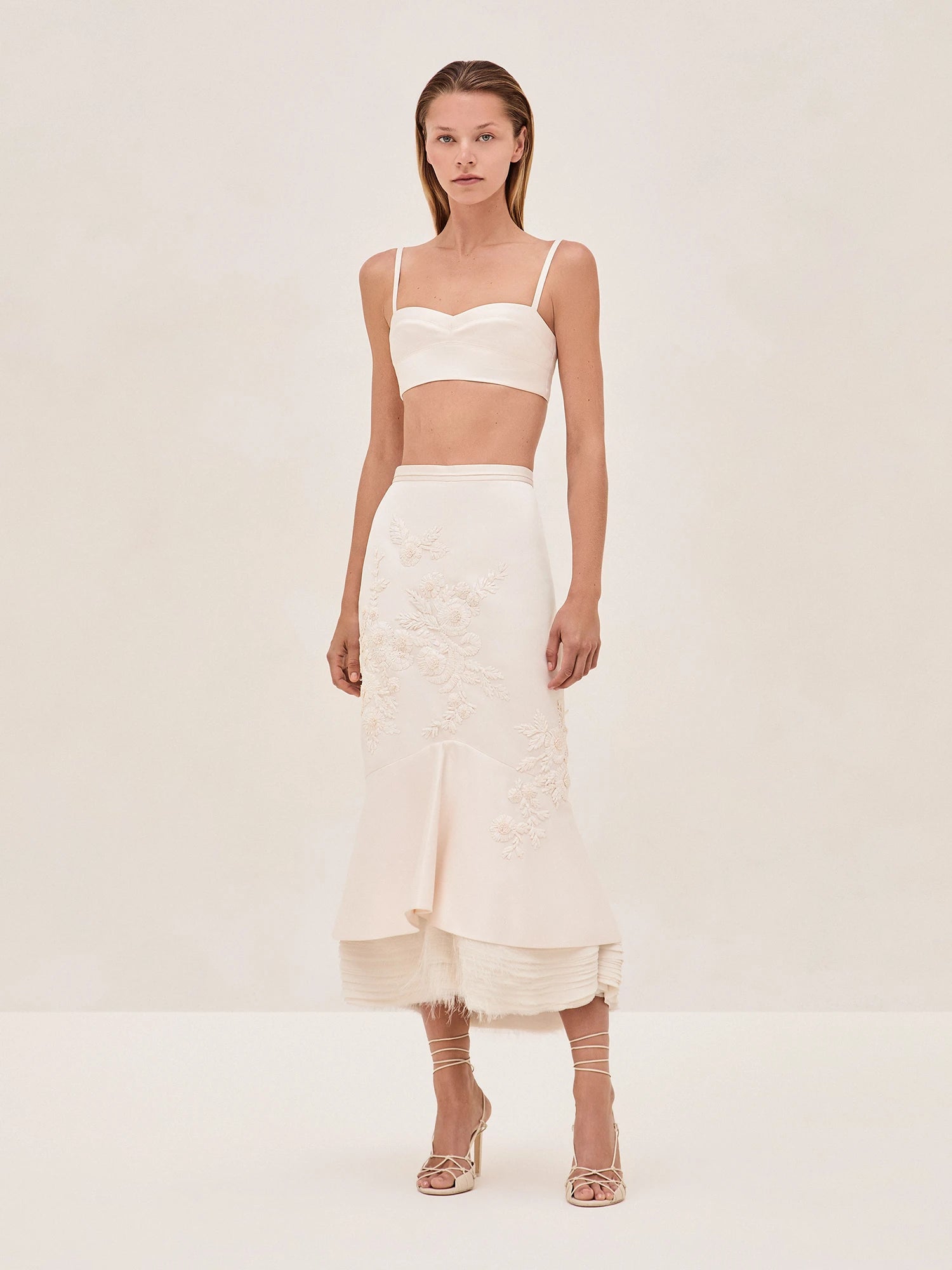 The Kiernan Skirt: The Kieran Skirt is an exquisite midi style that combines intricate floral embroidery with a flared hemline. Designed with a layered underlay, it adds soft volume and graceful movement. Pair it with the Mili Top for a refined ensemble.