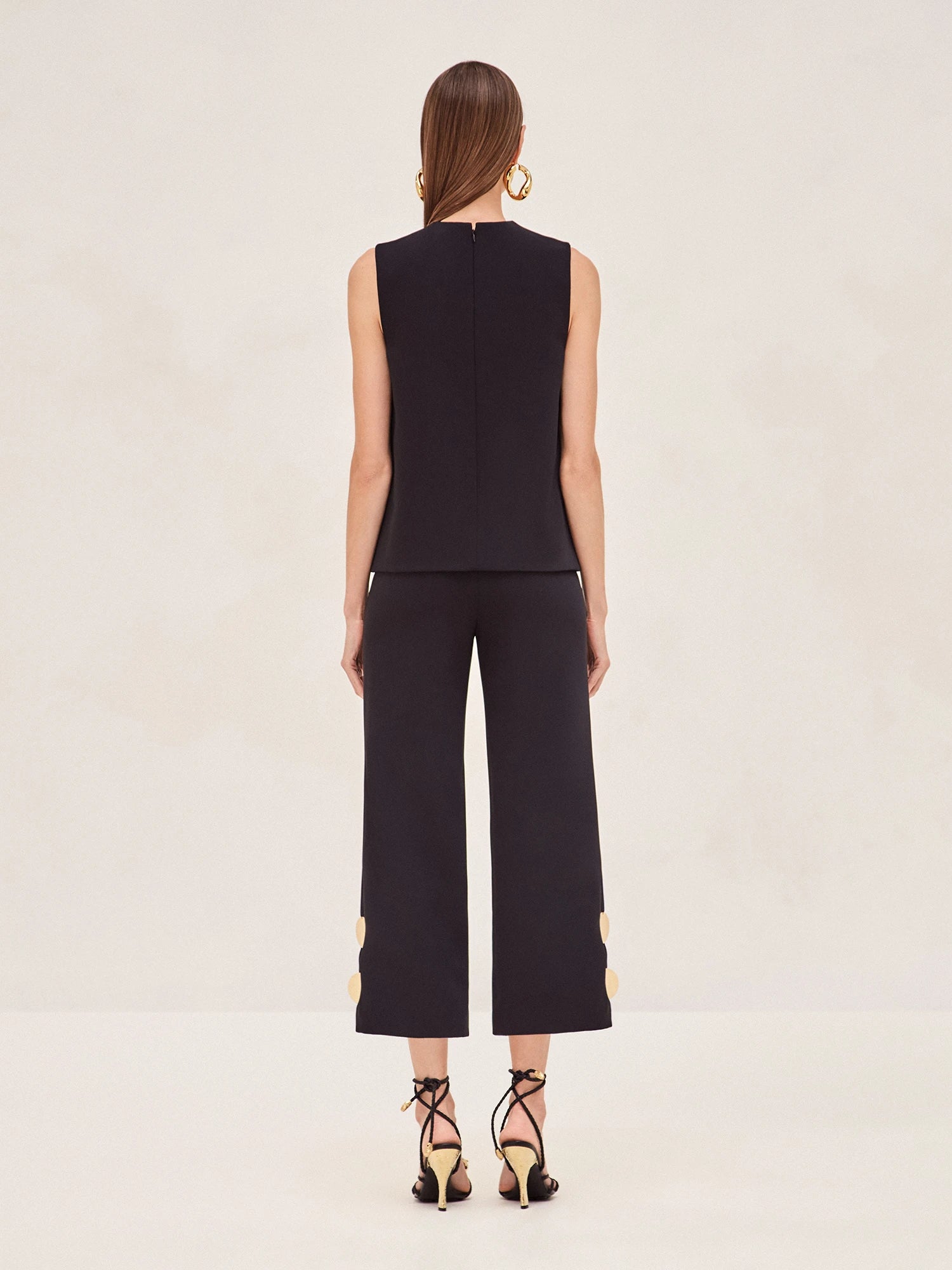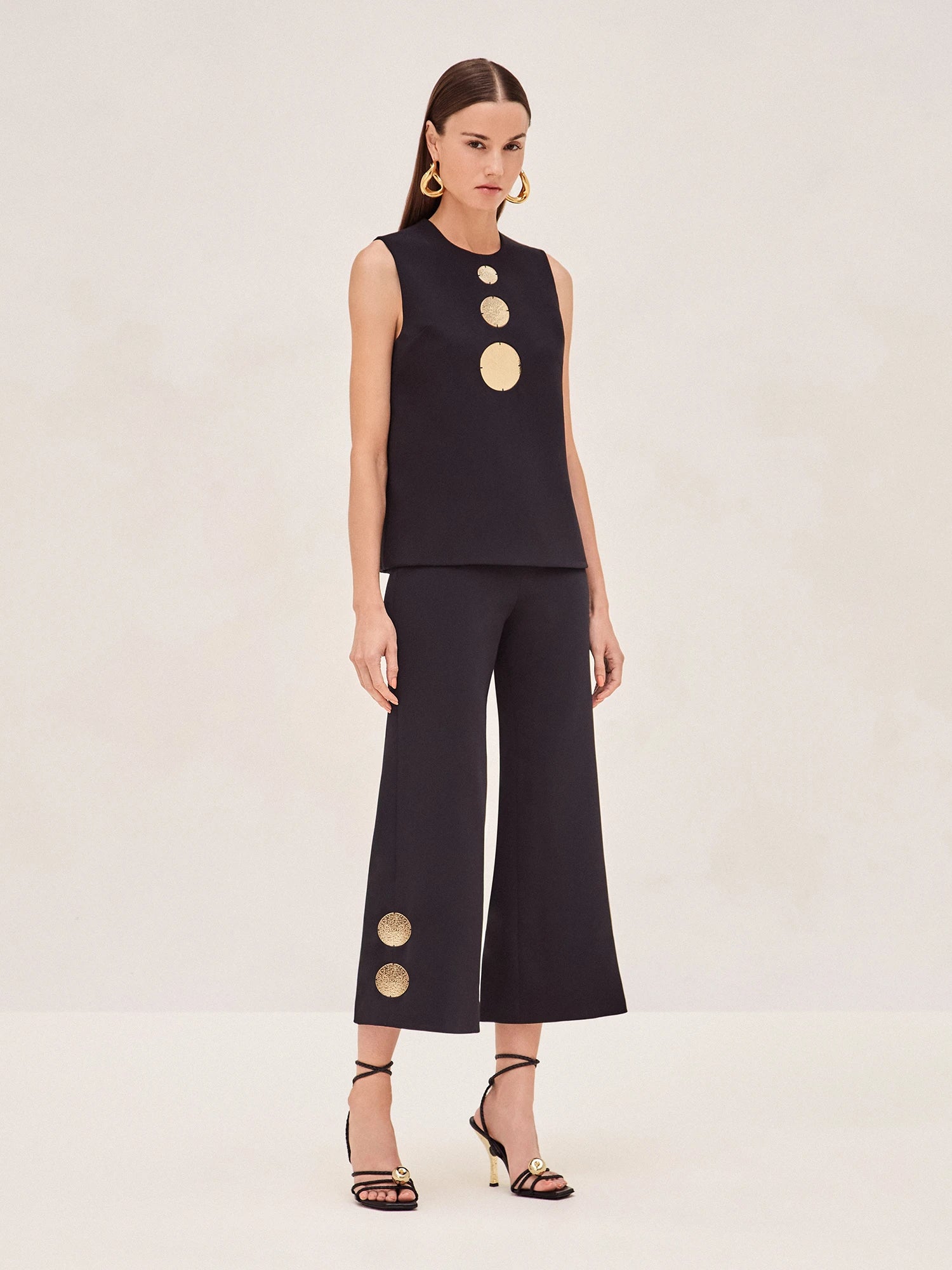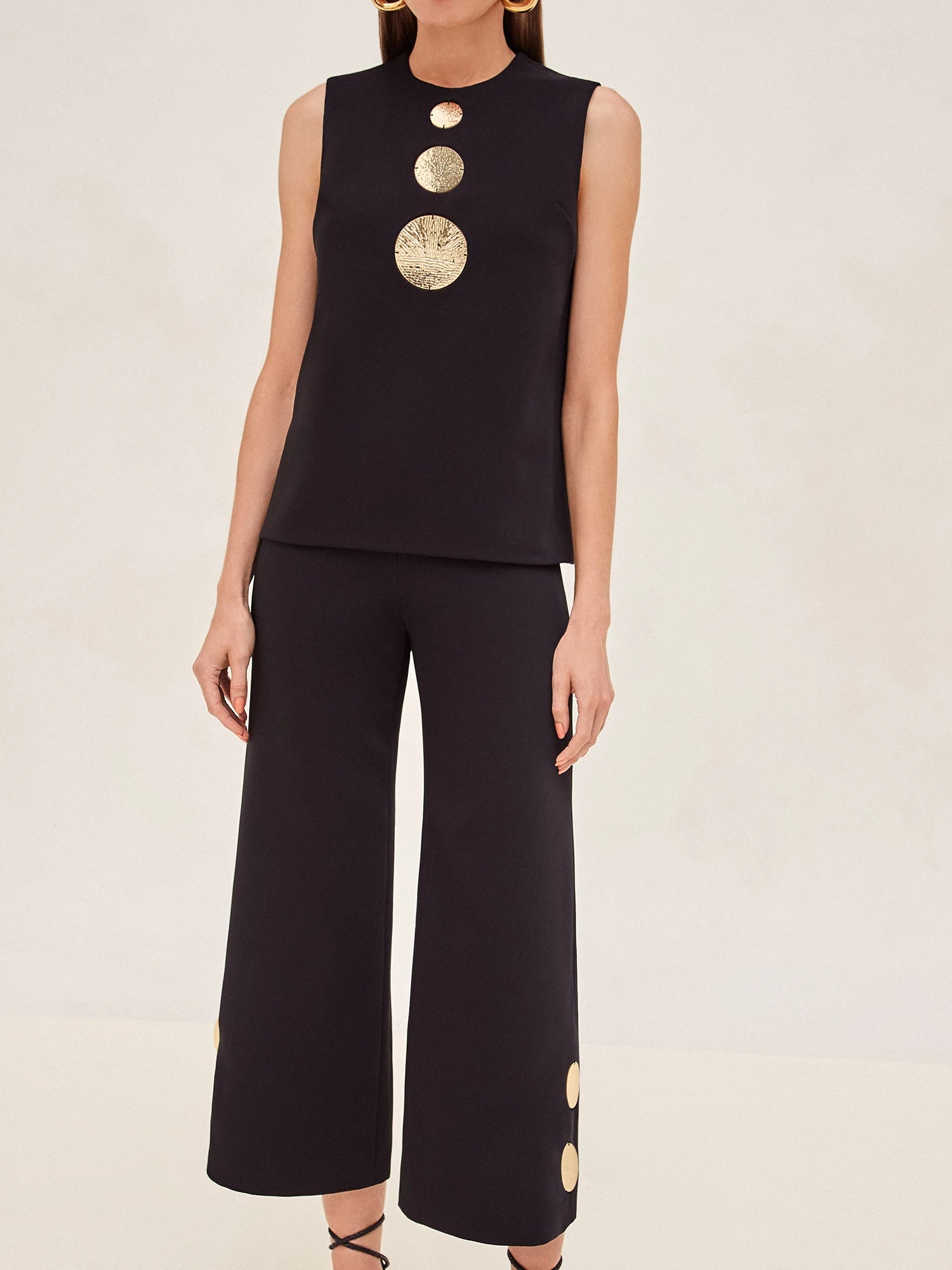 Elevate your ensemble with the Rich Pants, the perfect complement to the Amell Top. These pants are a sartorial staple that exudes vibrancy and style. The mid-rise design ensures a flattering fit, while the flared leg silhouette offers a nod to classic tailoring with a modern twist. The gold-tone coin embellishments mirror those on the Amell Top, creating a harmonious and luxurious set. Ideal for a polished day-to-evening look.