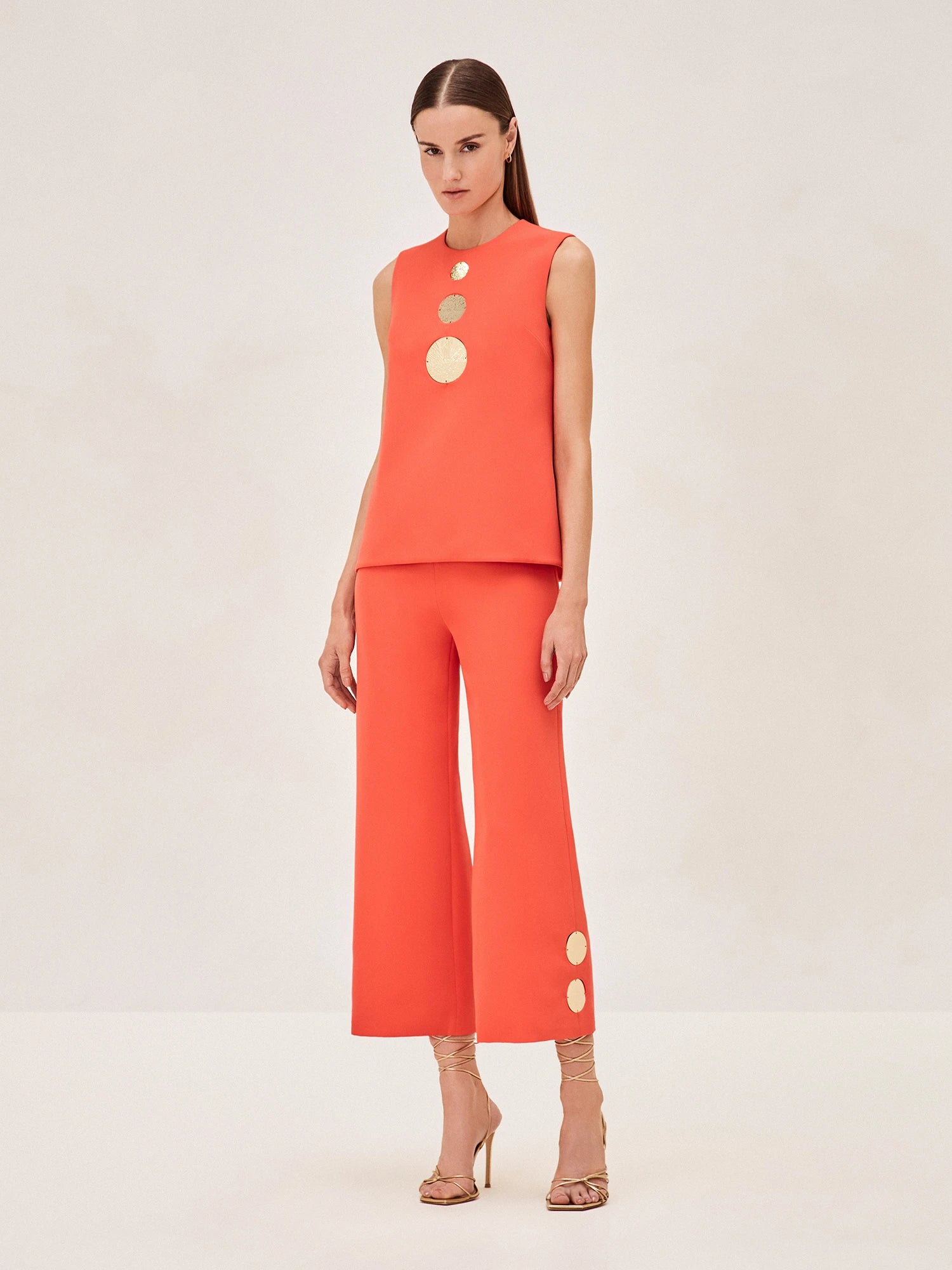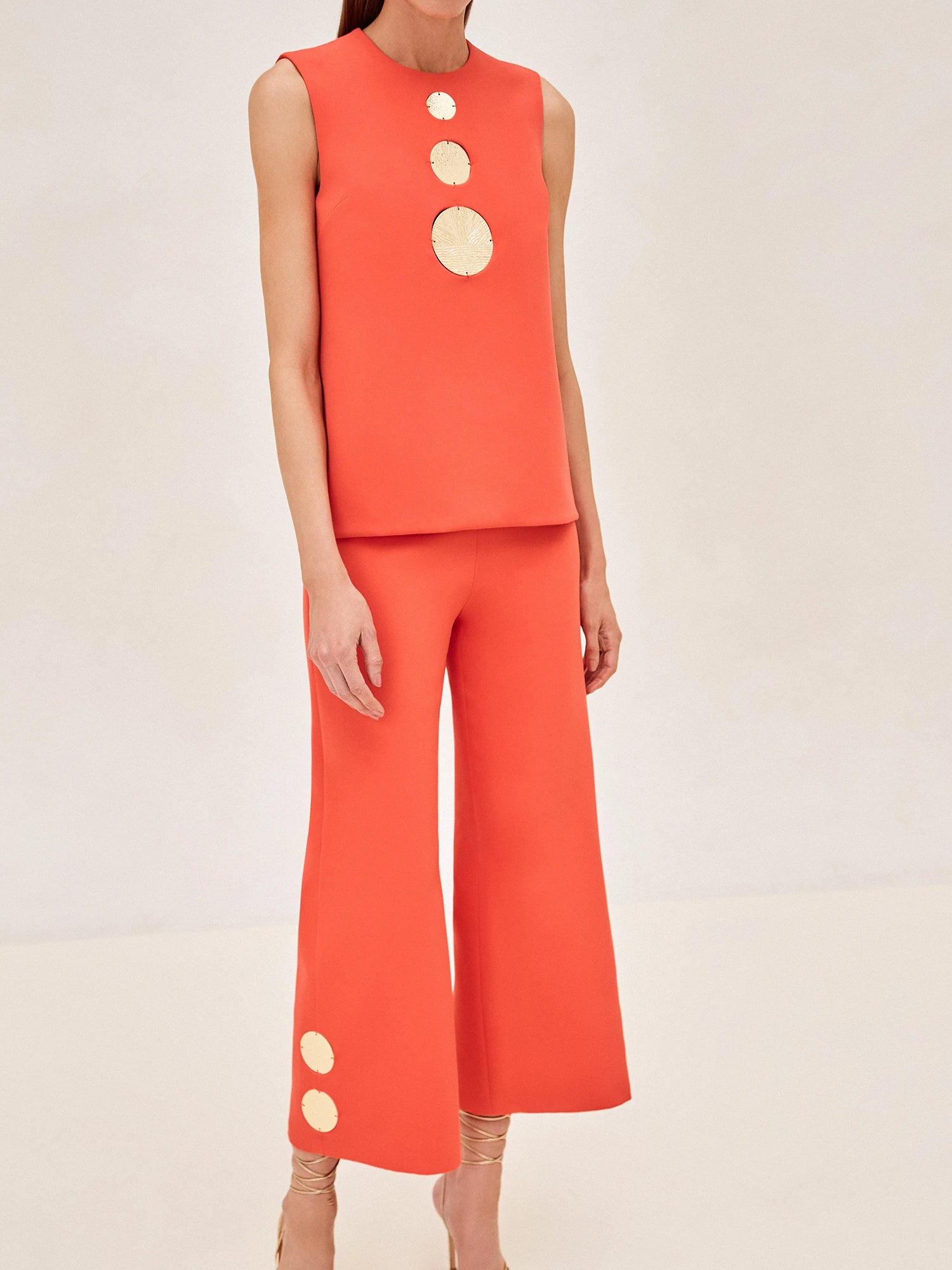 Elevate your ensemble with the Rich Pants, the perfect complement to the Amell Top. These pants are a sartorial staple that exudes vibrancy and style. The mid-rise design ensures a flattering fit, while the flared leg silhouette offers a nod to classic tailoring with a modern twist. The gold-tone coin embellishments mirror those on the Amell Top, creating a harmonious and luxurious set. Ideal for a polished day-to-evening look.
