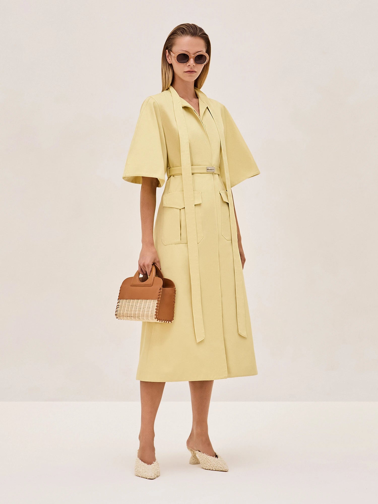 The Ilardi Midi Dress combines structured tailoring with feminine sophistication. Featuring a sharp collar and flared sleeves, it’s designed for a polished, contemporary look. A belted waist with a sleek metal buckle creates a flattering silhouette, while extended neck ties and functional front pockets add versatility and practicality.
