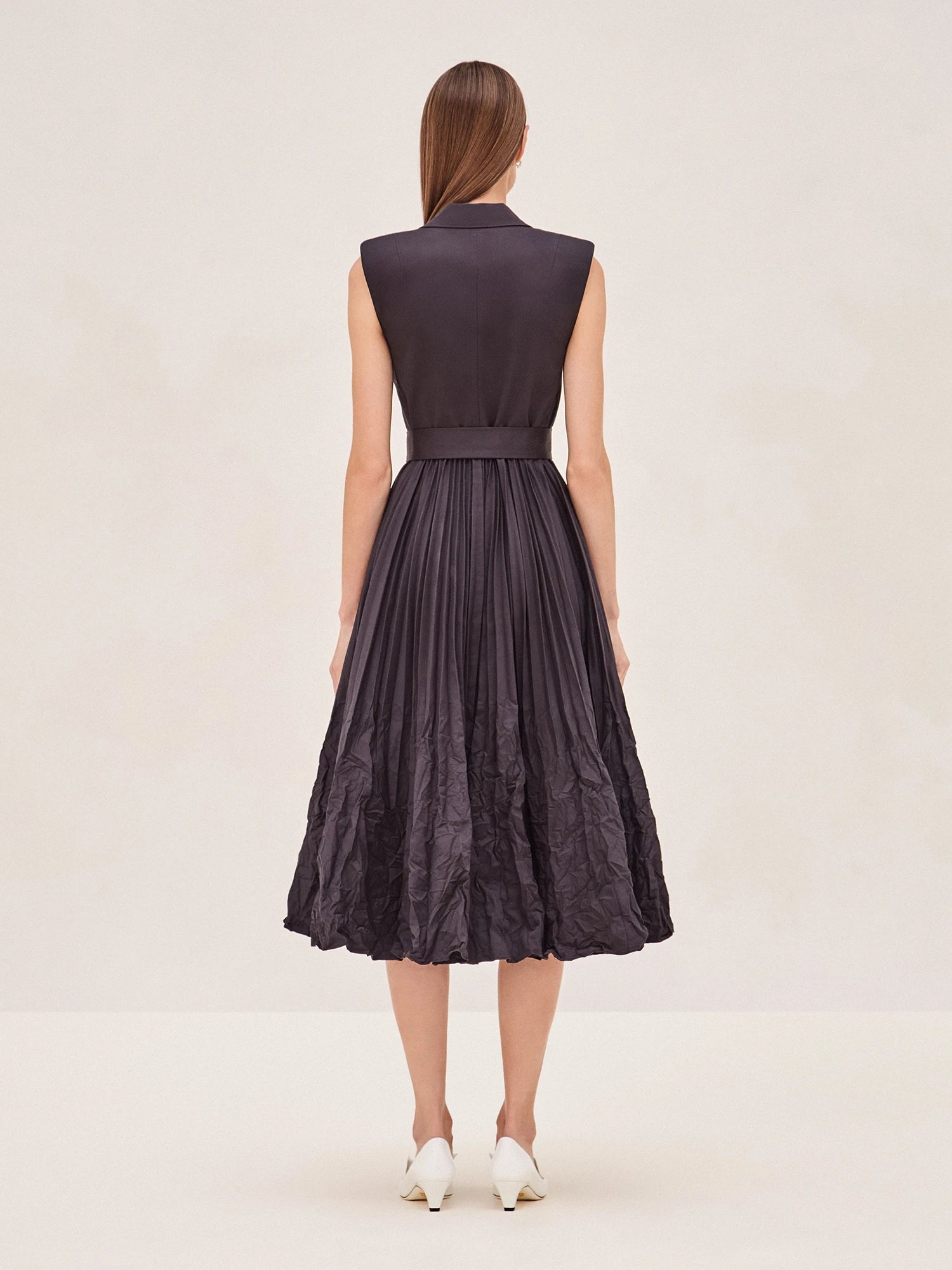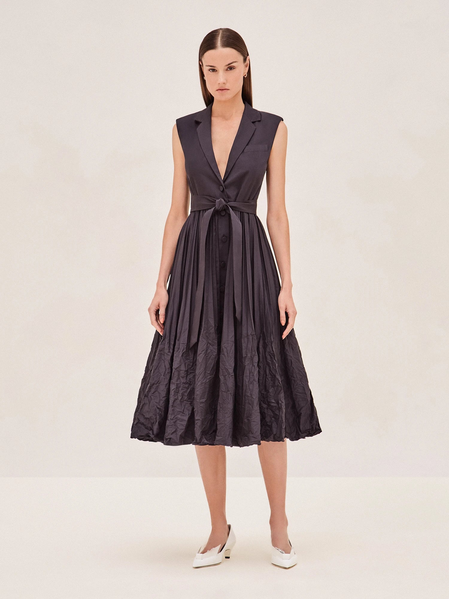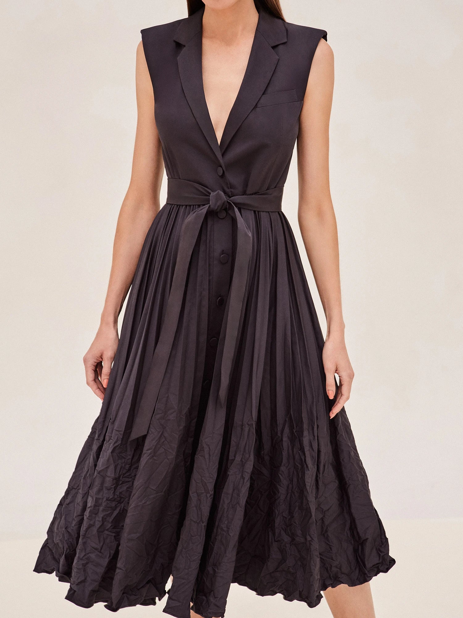 Embrace sophistication and style in the Beau Dress - a perfect fusion of sharp lapels and a fluid, plunging V-neckline. The crisp top harmonizes with the delicate crinkles of the skirt, creating a dynamic texture that moves effortlessly with you. A cinched waist, accented by a matching fabric belt, flatters your figure for a truly stunning silhouette.