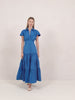 The Carosini Dress is a short sleeve tiered midi dress with shirring along the bust and a structured shirt collar.
