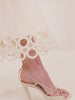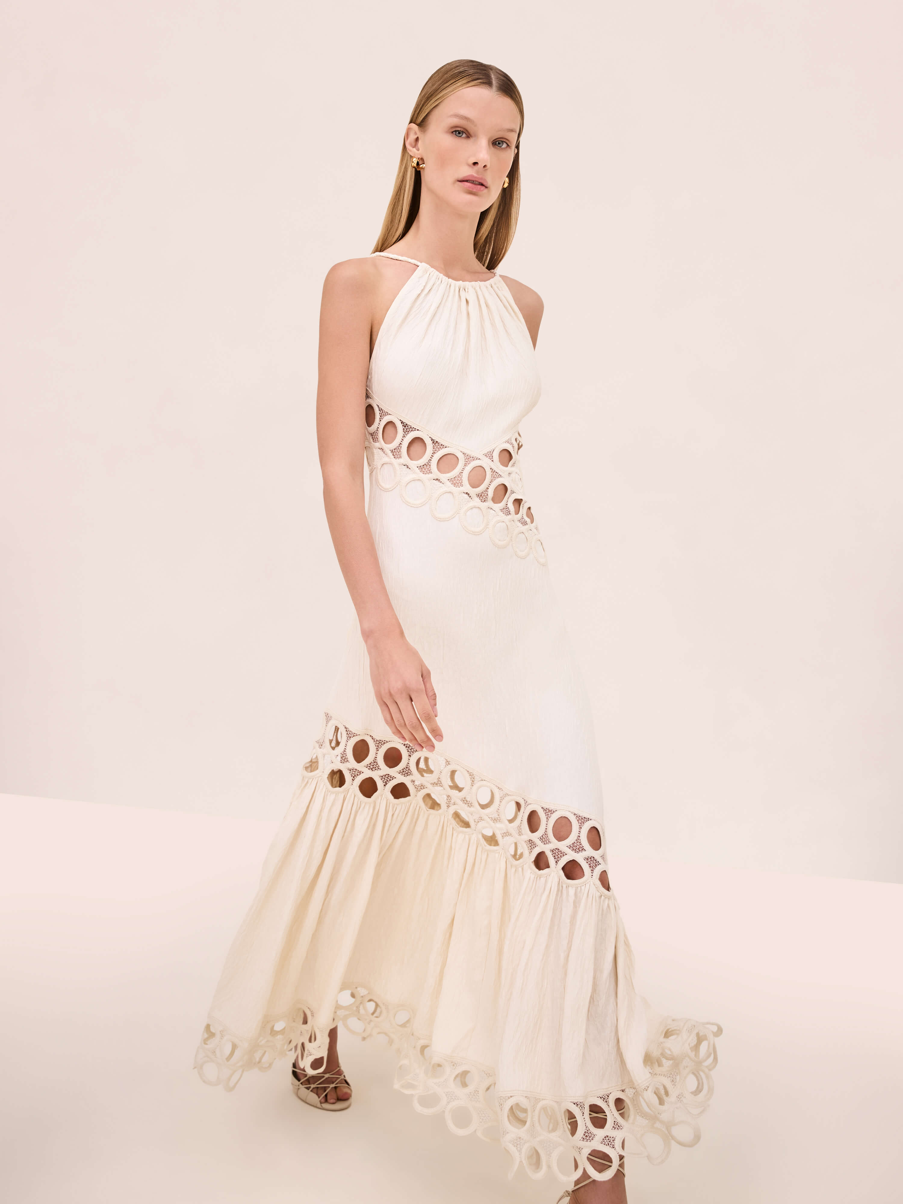 The Chelsea Dress is a halter silhouette featuring circular cutout detailing and a tiered hem.
