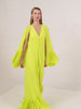 The Francia Dress is a floor-length silhouette with removable tiered bell sleeves, a gathered hem, and a tie neckline.