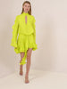 The Giovanna Dress is a long sleeve mini dress featuring ruffled trim, a smocked high neckline, and a cascading tie-front detail.
