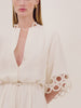 The Kalia Dress is a mini silhouette featuring circular cutout detailing and a tasseled rope belt.