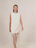 The Mackenzie Dress is a sleeveless mini shift dress featuring an attachable fringe skirt overlay.