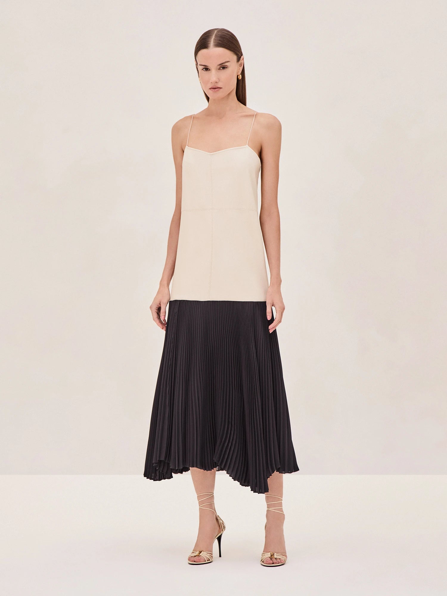Introducing the Piatta Midi, where sleek meets sophisticated. This dress combines the rich texture of vegan leather with the fluidity of a pleated skirt, creating a striking contrast that's effortlessly chic. The minimalist top has with delicate spaghetti straps, giving it a modern, streamlined silhouette, while the flowing midi skirt adds movement and grace.