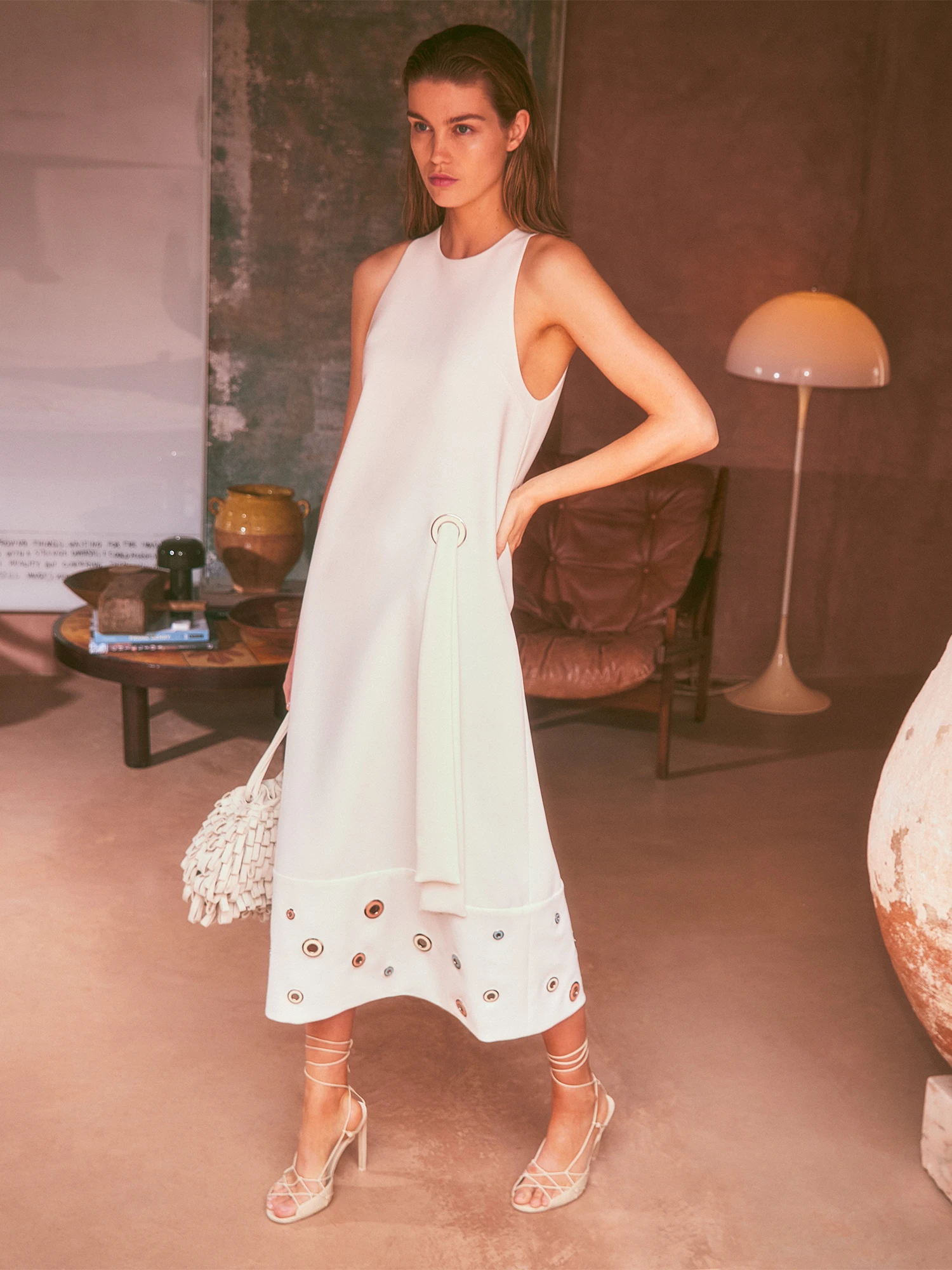 The Delfin Dress is a modern shift style with elevated details. Crafted in a clean, sleeveless silhouette, it features a unique side tie and an embellished hem with grommet accents for a touch of contemporary edge. Perfect for daytime events or evening occasions, this dress pairs effortlessly with strappy heels and a statement bag to complete the look.