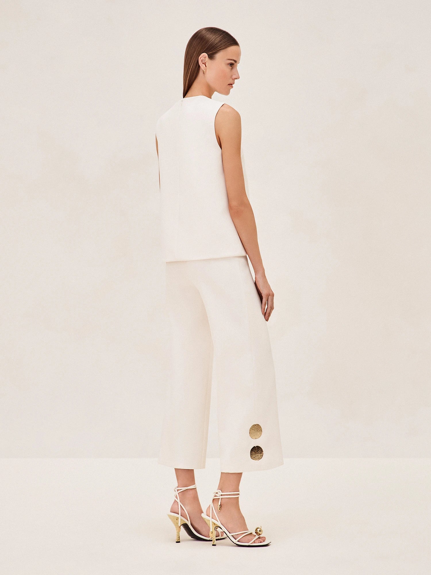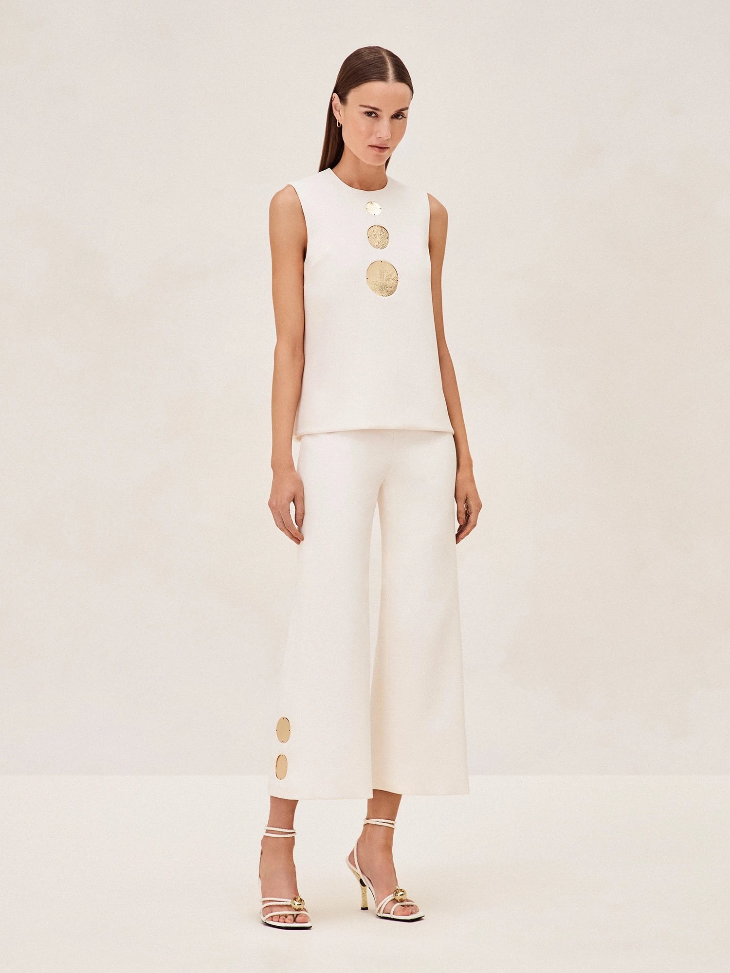 Introducing the Amell Top, a harmonious fusion of sophistication and modernity. Its sleek design accentuates a structured silhouette, exuding effortless chicness. The standout feature is the exclusive gold-tone coin embellishments, elevating the garment to a realm of opulence and refinement. Match it with the Rich Pants for a cohesive look or with the Shelby Shorts for a more laid-back yet refined ensemble.