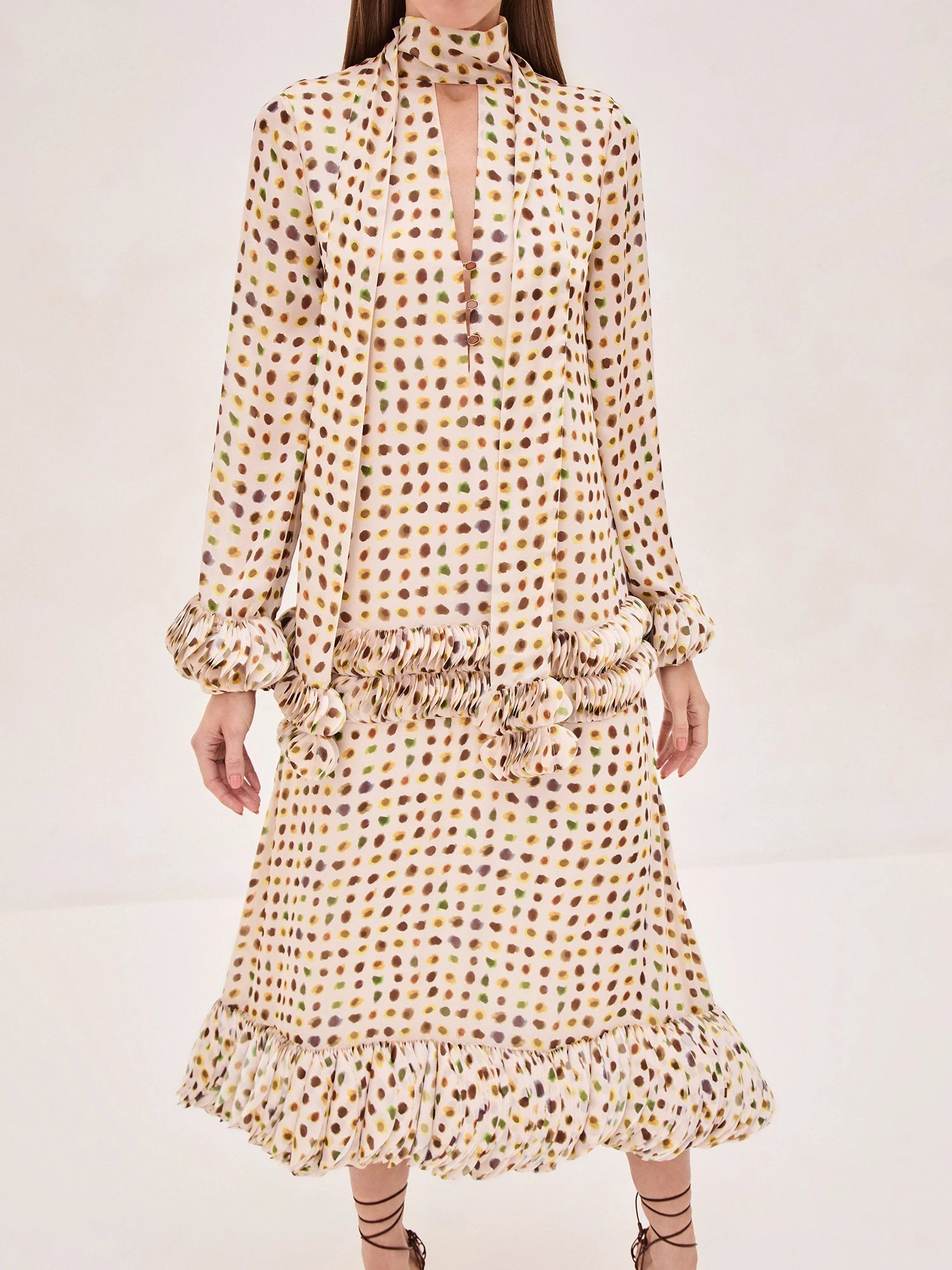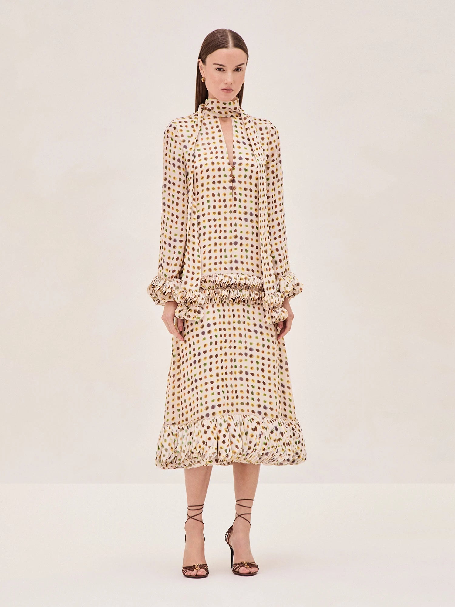 Introducing the Hilana Dress, a statement piece that marries vintage charm with modern flair. This dress features a chic necktie detail, a captivating polka-dot print that feels both playful and sophisticated, and a flowing silhouette. The ruffled accents at the cuffs and hem add a touch of romance, making this dress a must-have for any occasion.
