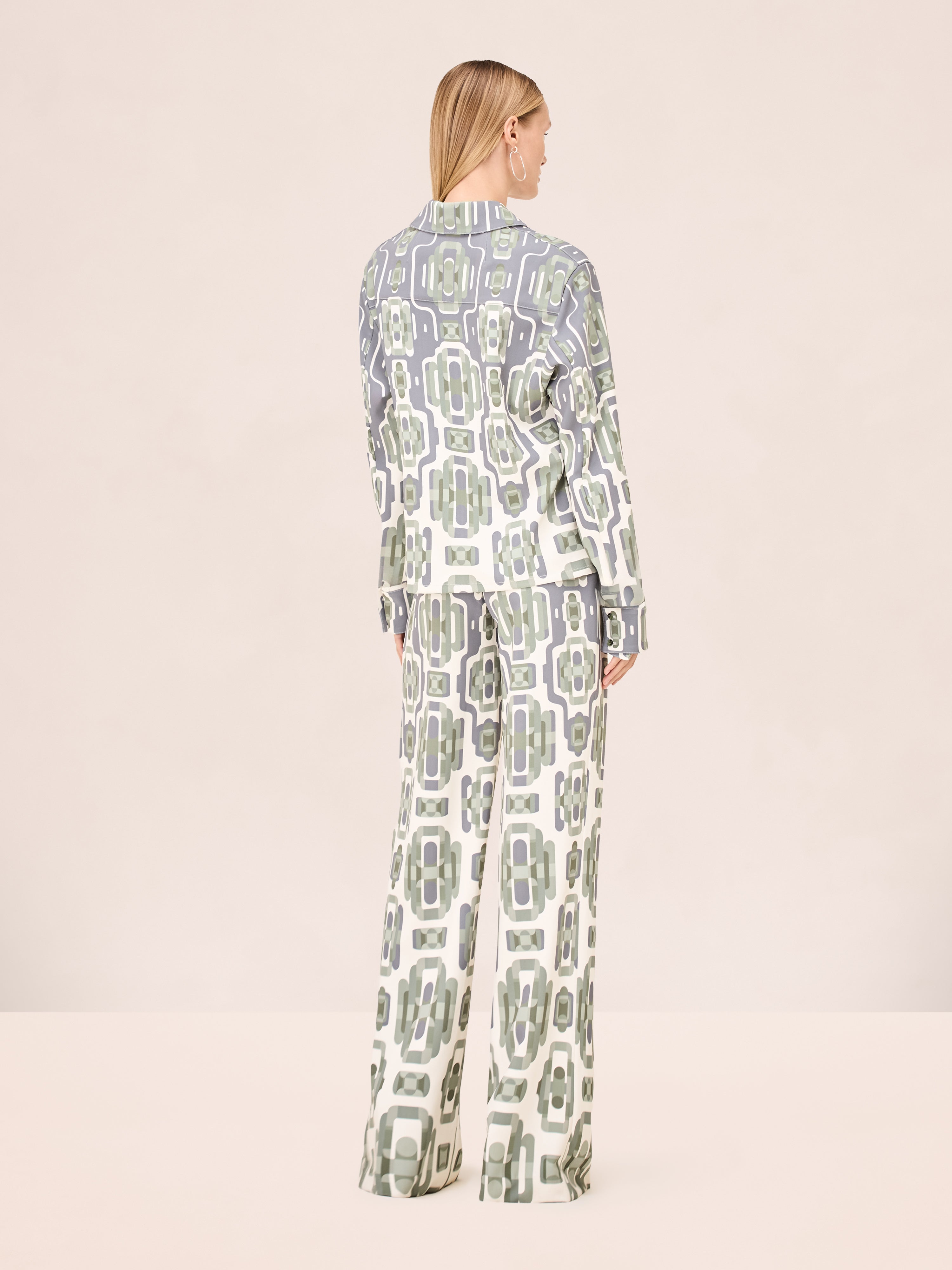 The Salerno Pant is a wide leg trouser featuring a geometric print, paired with the Kalisz Jacket.