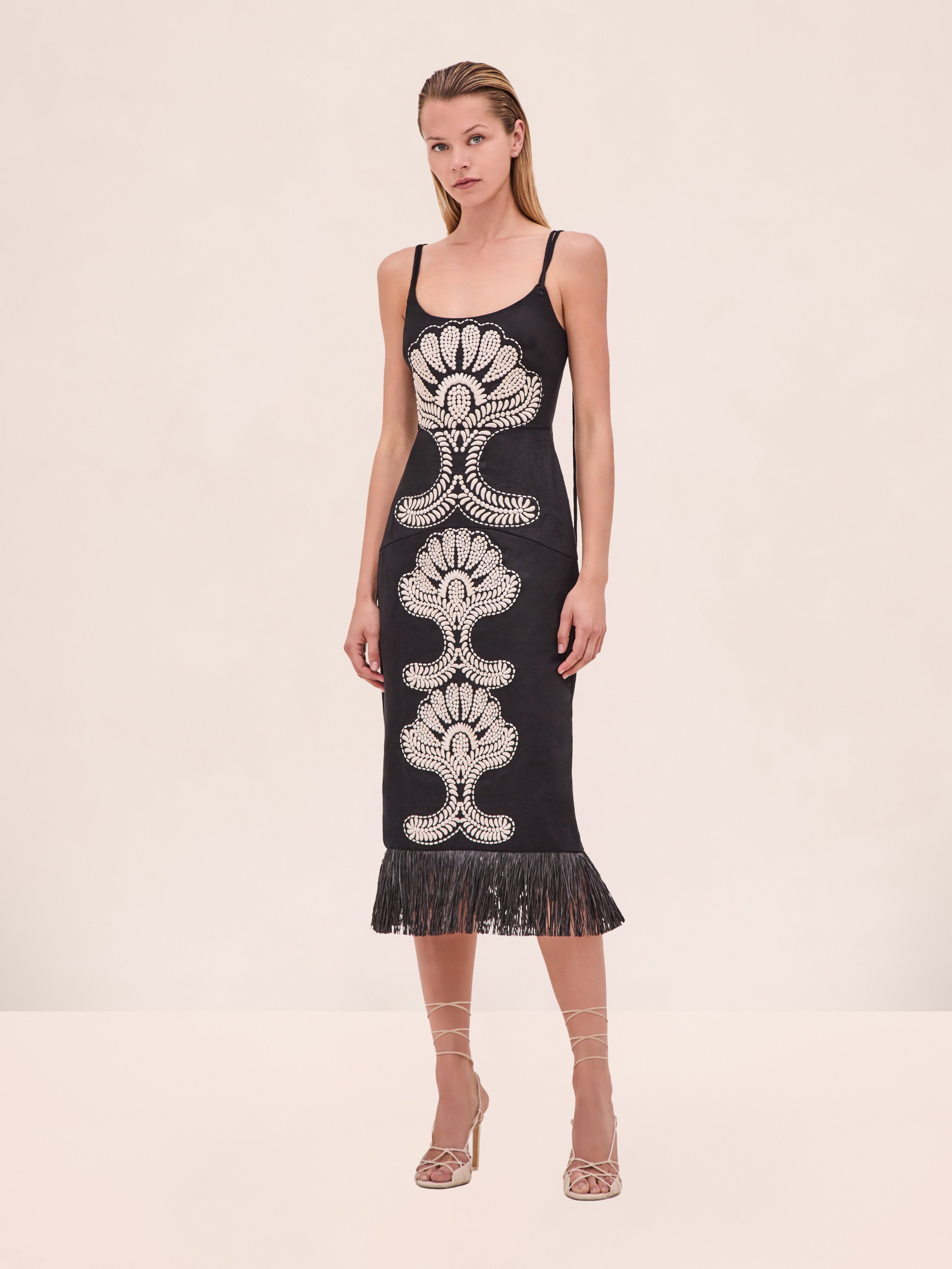 The Naturi Dress is an embroidered midi dress featuring intricate floral detailing and a  raffia trim at the hem.