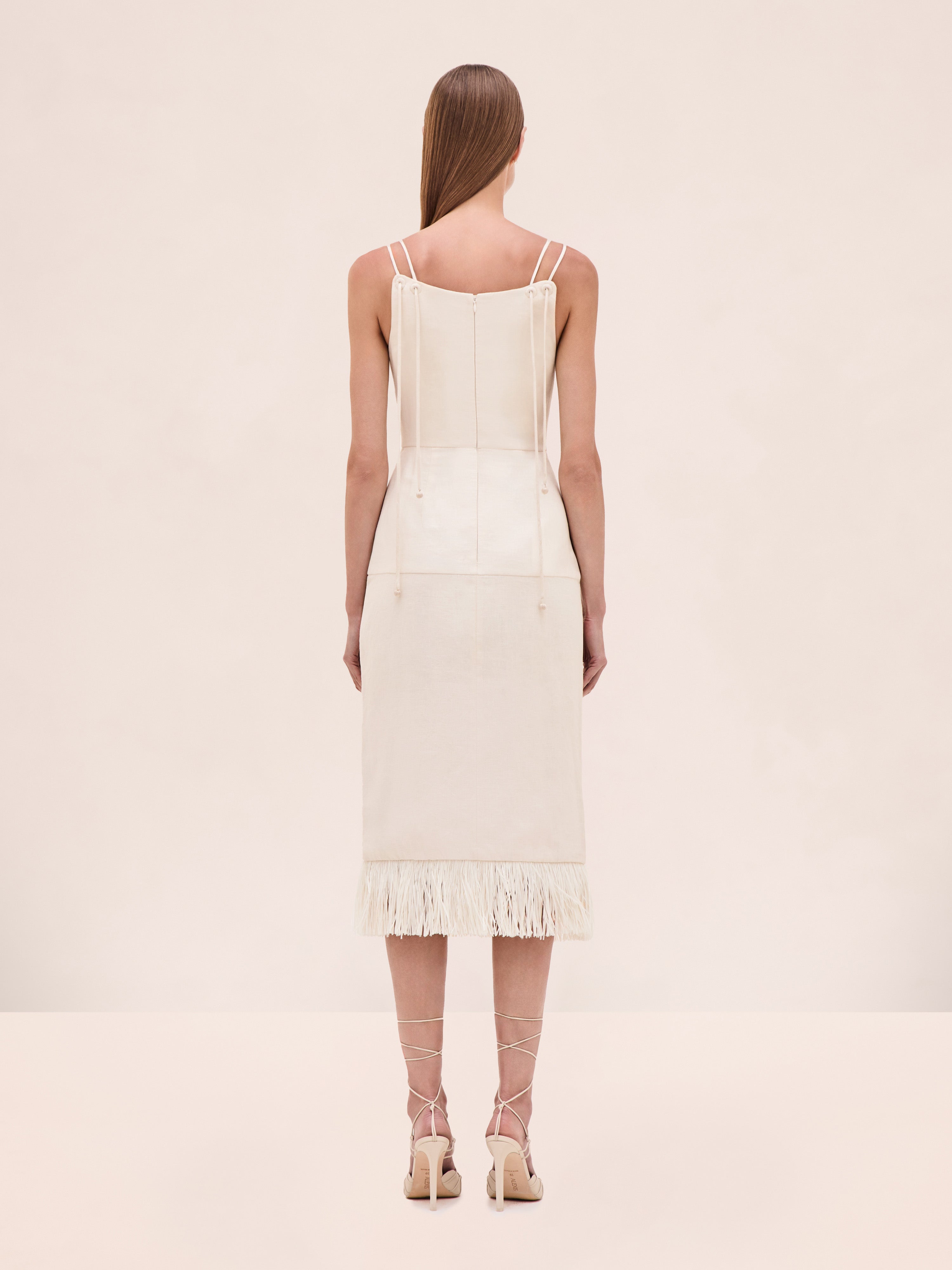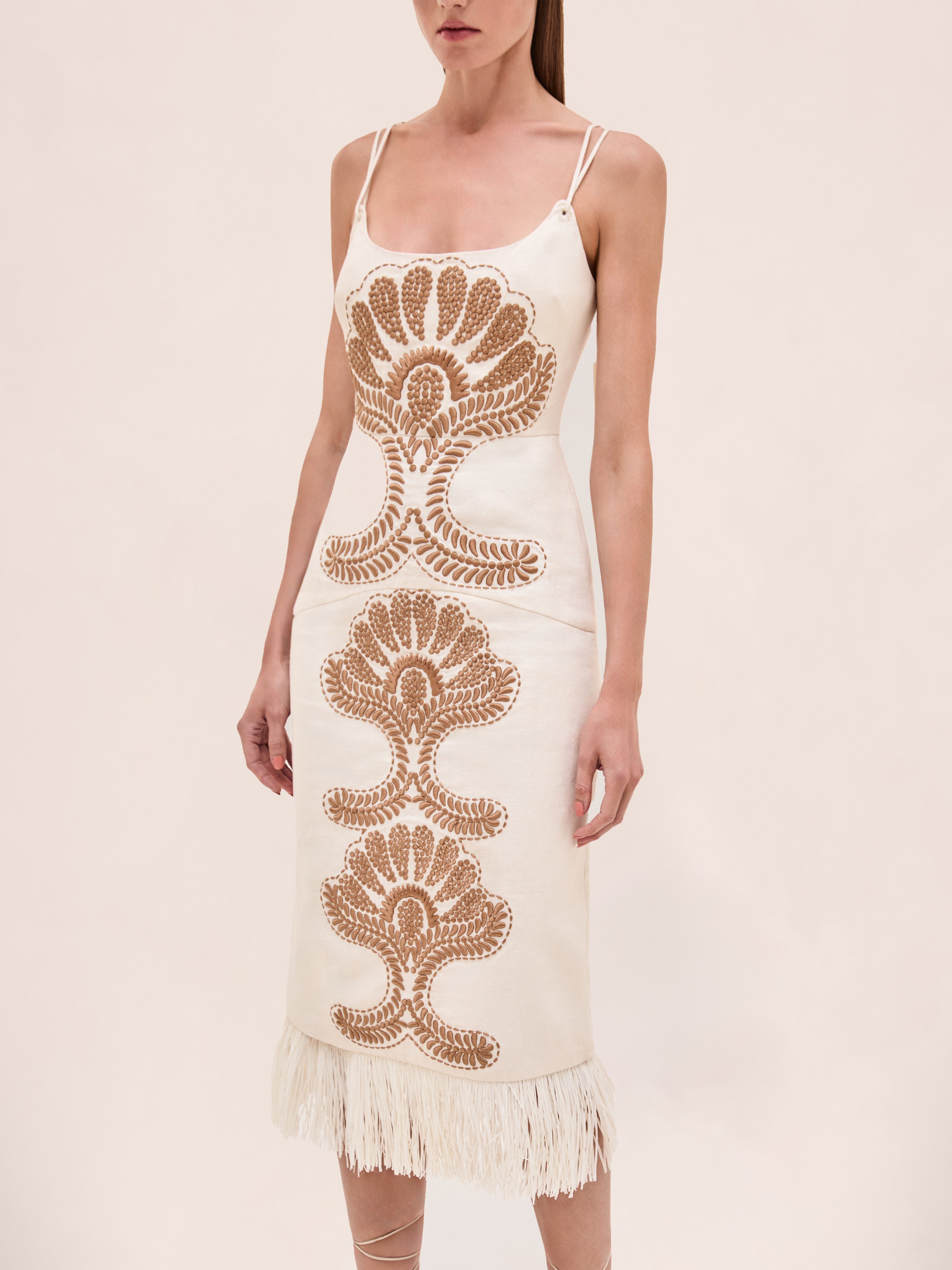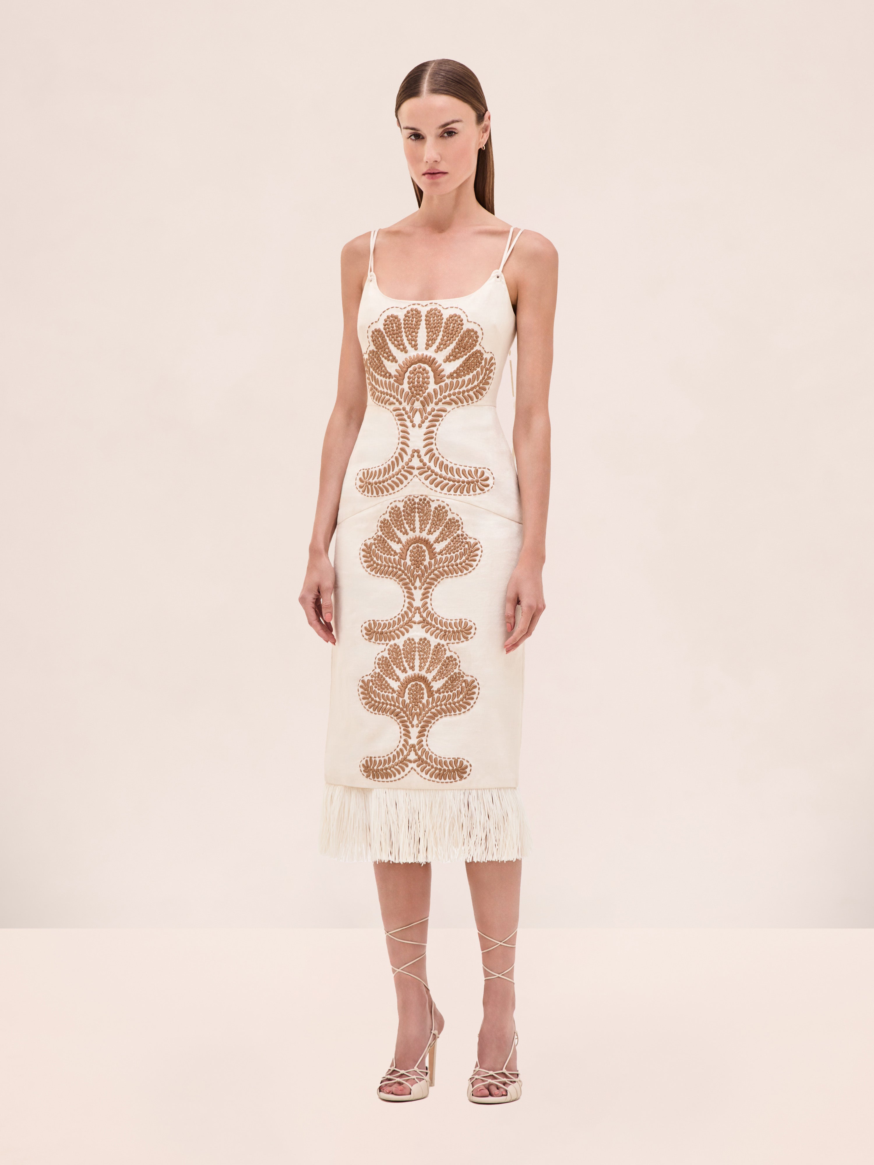 The Naturi Dress is an embroidered midi dress featuring intricate floral detailing and a raffia trim at the hem.
