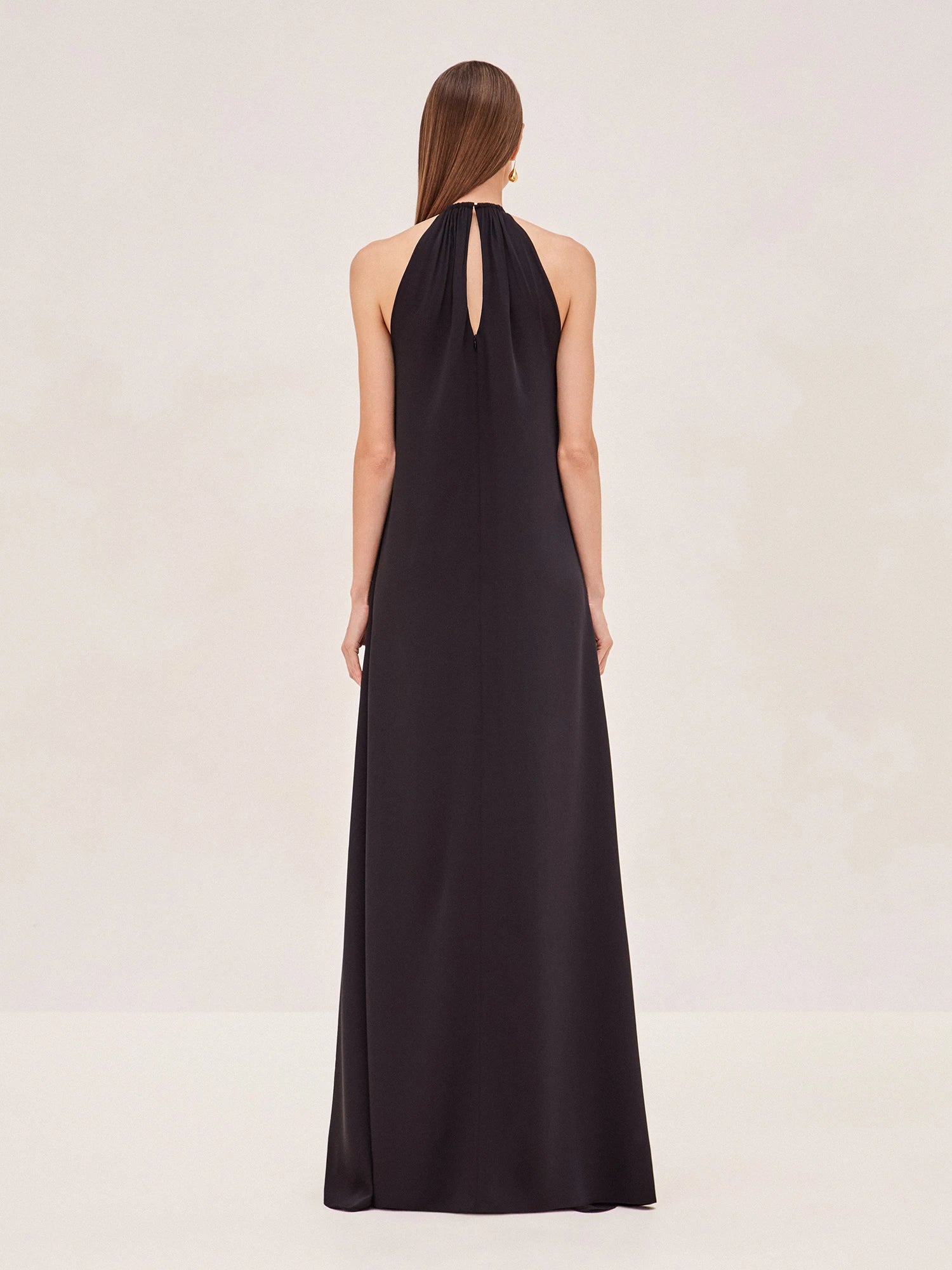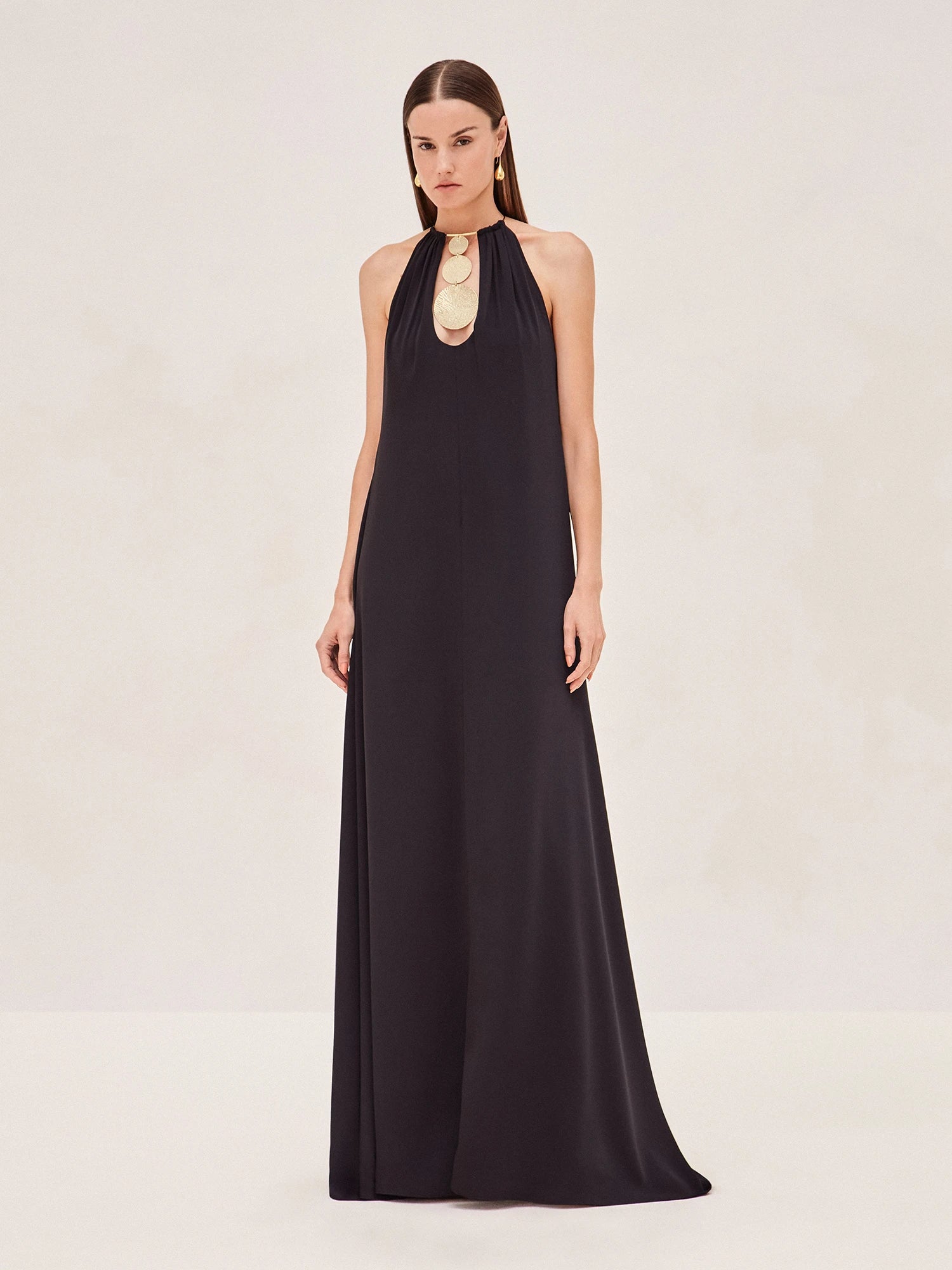 Introducing the Celestino Dress - a stunning display of daring elegance. This floor-length gown embodies the epitome of poise and charm. The elegant high-neck design gracefully meets at the nape, leaving the shoulders bare for a touch of refined allure. Adorned with cascading golden coin embellishments along the neckline, it's a dress that demands to be noticed. Flowing effortlessly, the Celestino Dress will captivate with its regal drapery.