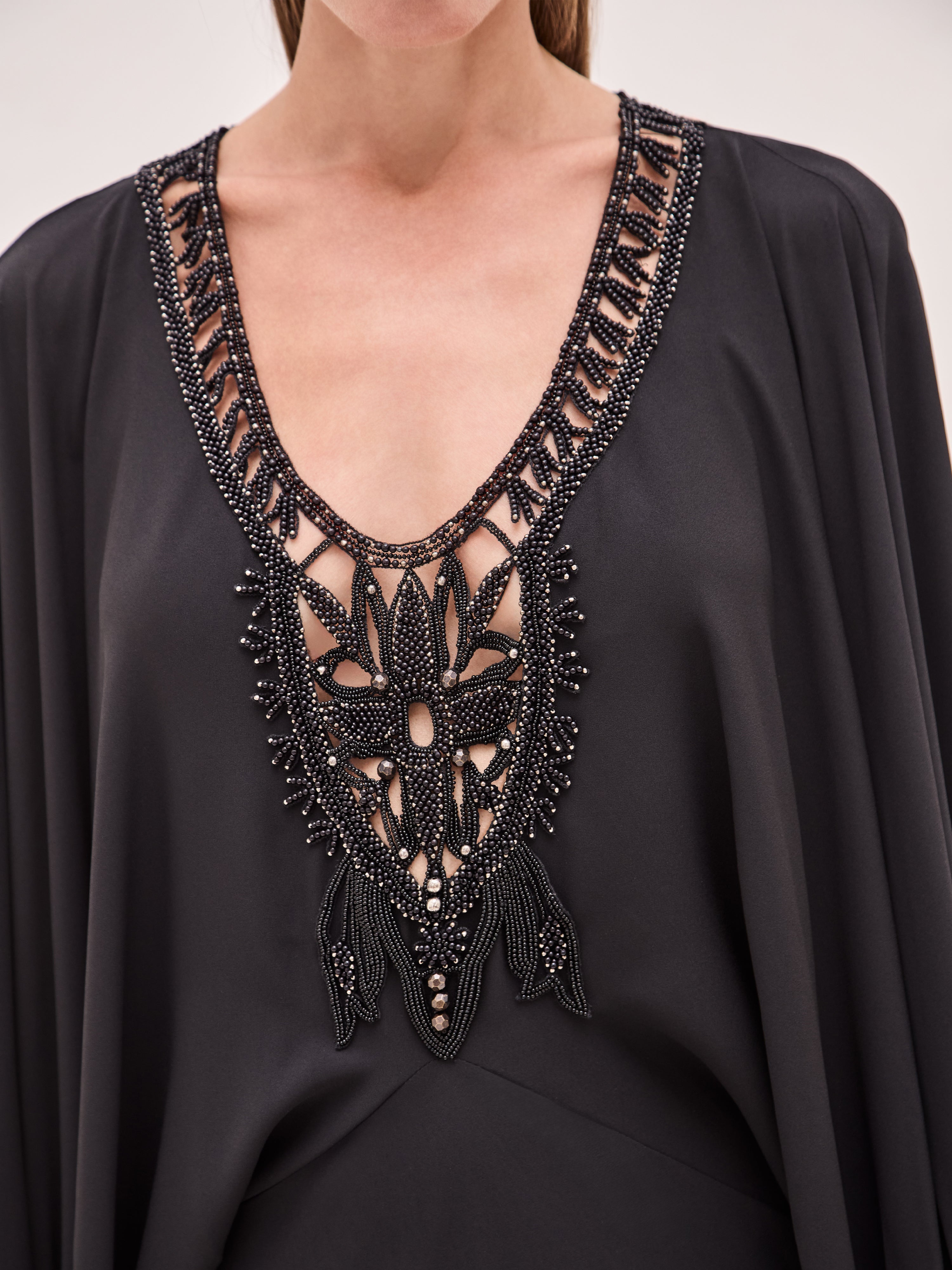 The Genevive Dress is a fluid crepe gown featuring a hand-beaded necklace at the neckline and long, flowy sleeves.