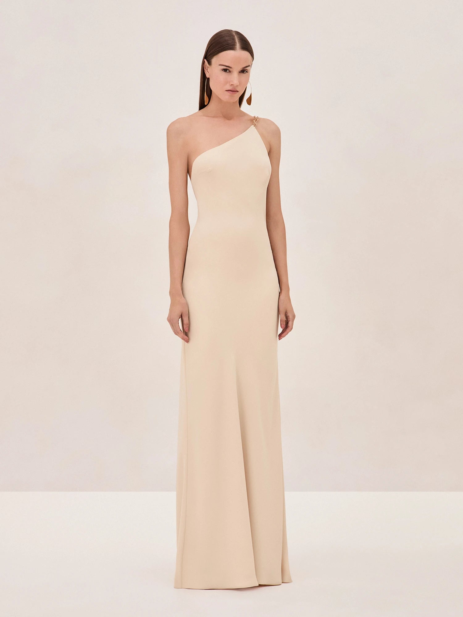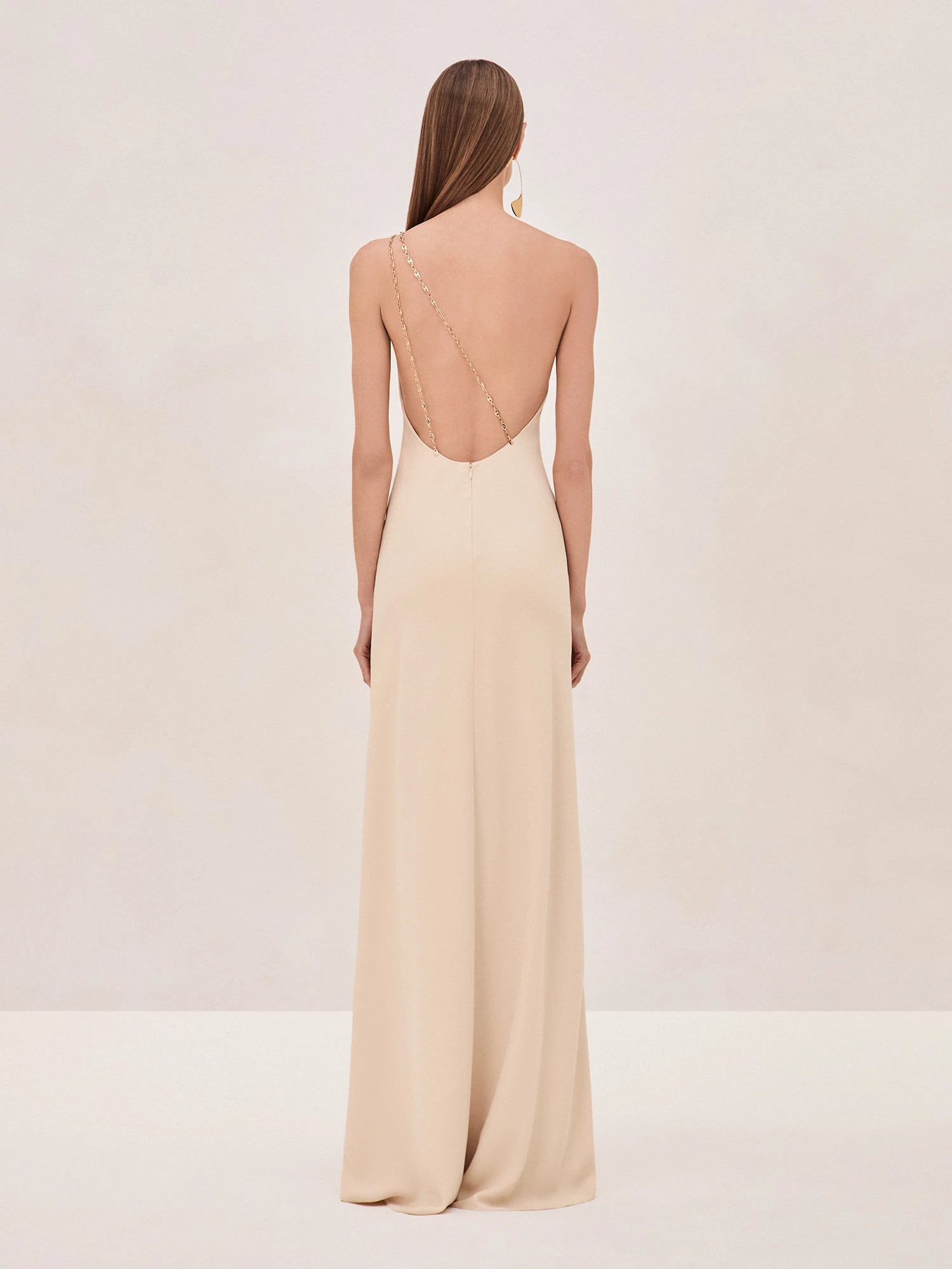 the Tribeca Gown, where simplicity meets sophistication. This elegant cream gown features a striking double-strand gold chain that drapes over one shoulder, adding a touch of unique detail to its minimalist design. The gown’s open back and fluid silhouette create a graceful, flowing look that’s perfect for any formal event.
