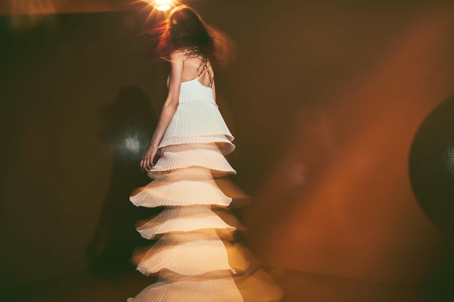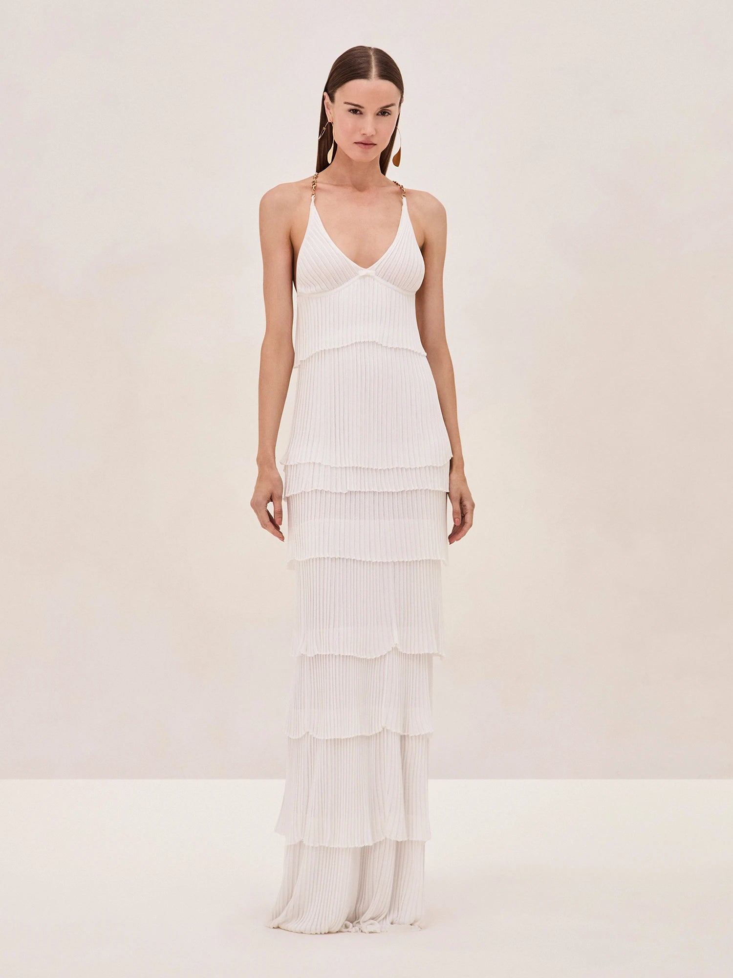 Introducing the Yira Dress - a stunning display of cascading elegance. This floor-length gown features pleated tiers that form a striking and refined silhouette. With a deep V-neckline and delicate gold chain straps, it exudes allure, while its flowing design offers graceful movement with each step. Whether for a lavish affair or intimate gathering, the Yira Dress provides timeless sophistication with a touch of contemporary glamour.