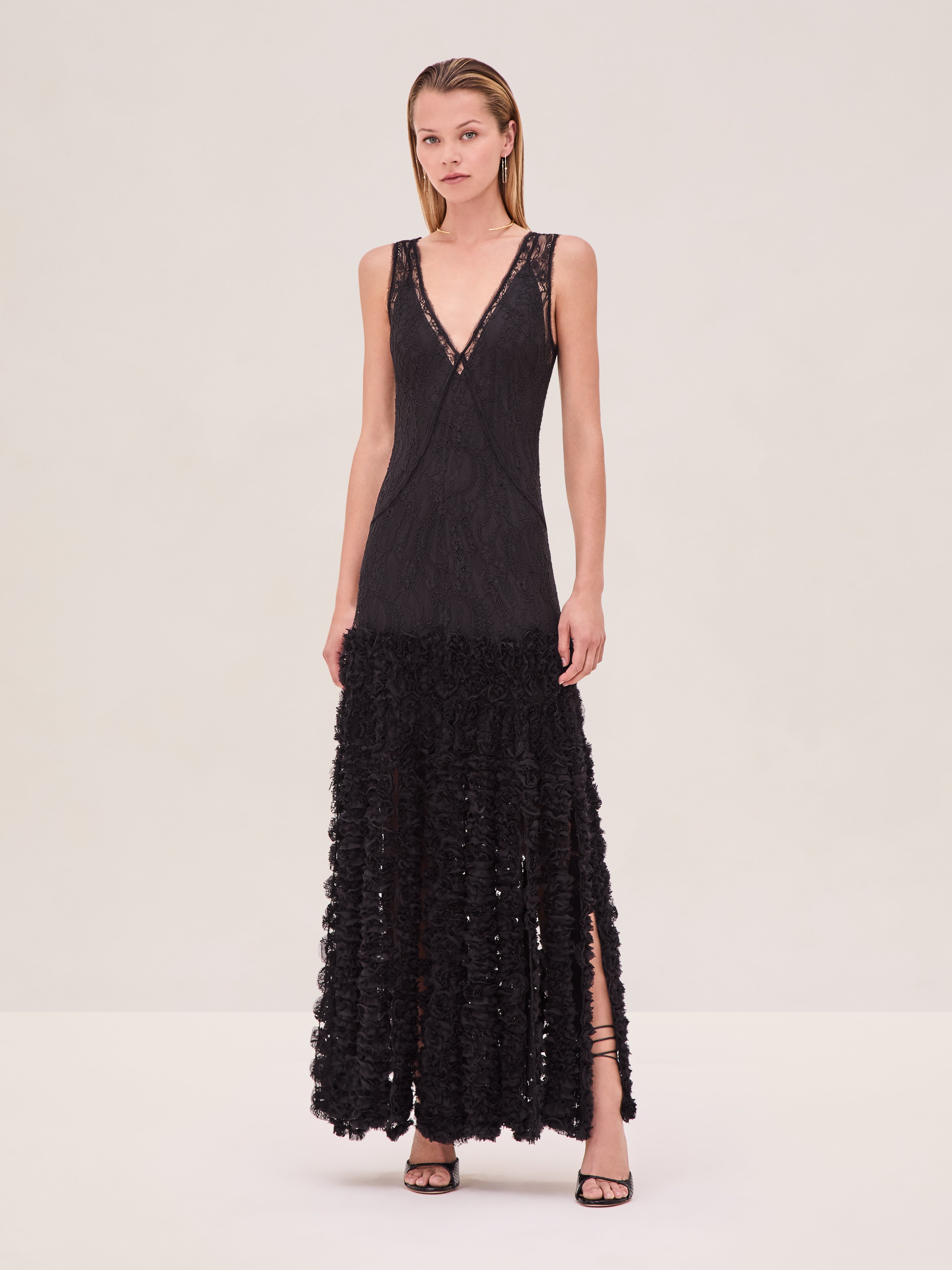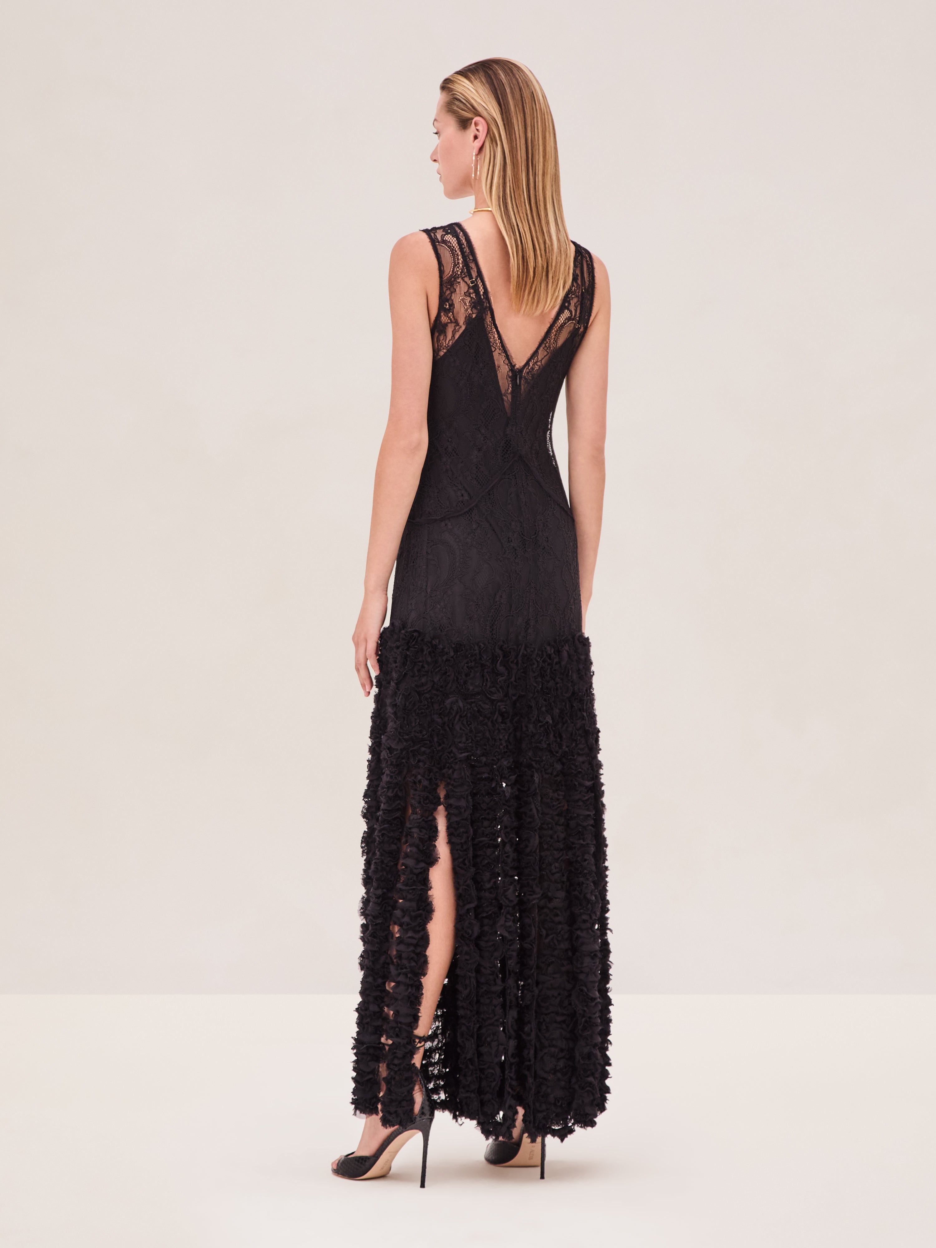 The Jeysa Dress is a lace gown with an embroidered and fringe hem detail and includes a removable slip for added coverage.