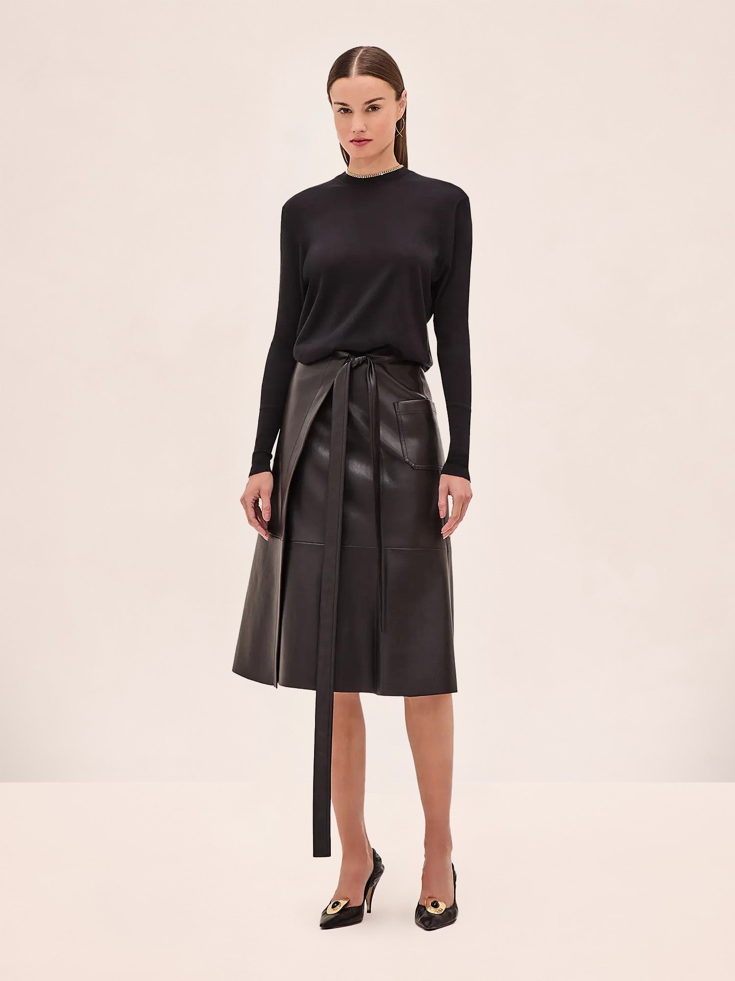 The Ellena Skirt is a wrap skirt with an adjustable tie waist and patch pocket detailing.