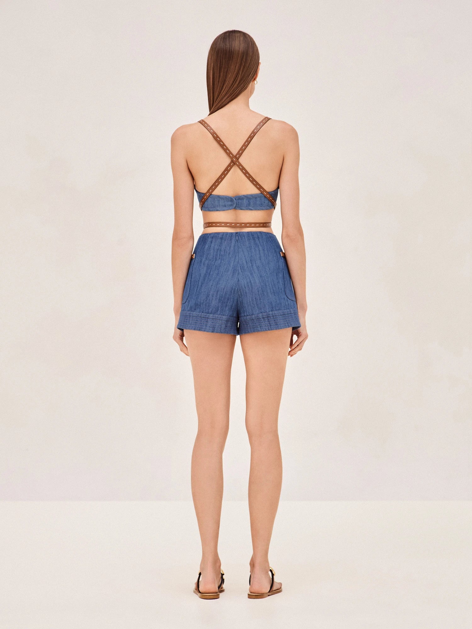 The Allan Short features a denim design and faux leather pocket detail. Pair it with the Kenji top for a coordinated look.