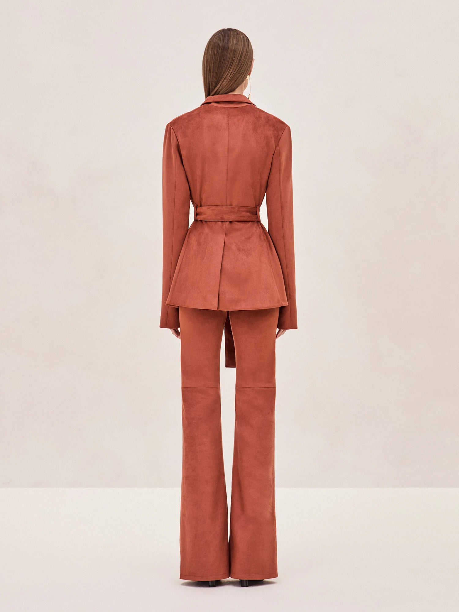 The Lazlo Vegan Suede Blazer features a sleek, structured silhouette with a deep collar and button-front closure. The adjustable waist tie cinches the waist, adding a flattering shape and a touch of versatility. Designed to pair perfectly with the Byers Pant.