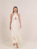 The Ambrosio Dress is a halter silhouette with ribbon embroidered detailing and fringe trim.