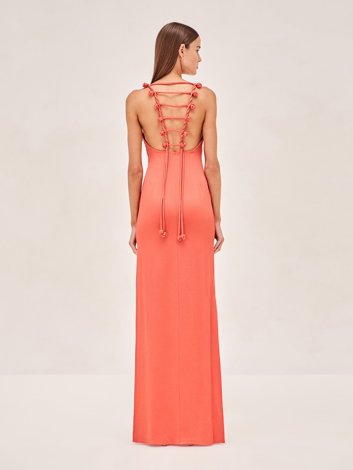 The slinky Letitia Dress is the perfect choice for any formal event. Its scoop neck design and knotted back detail provide an elegant, timeless look. Twisted straps and a side slit provide an added bit of flair, making it suitable for weddings and special occasions.