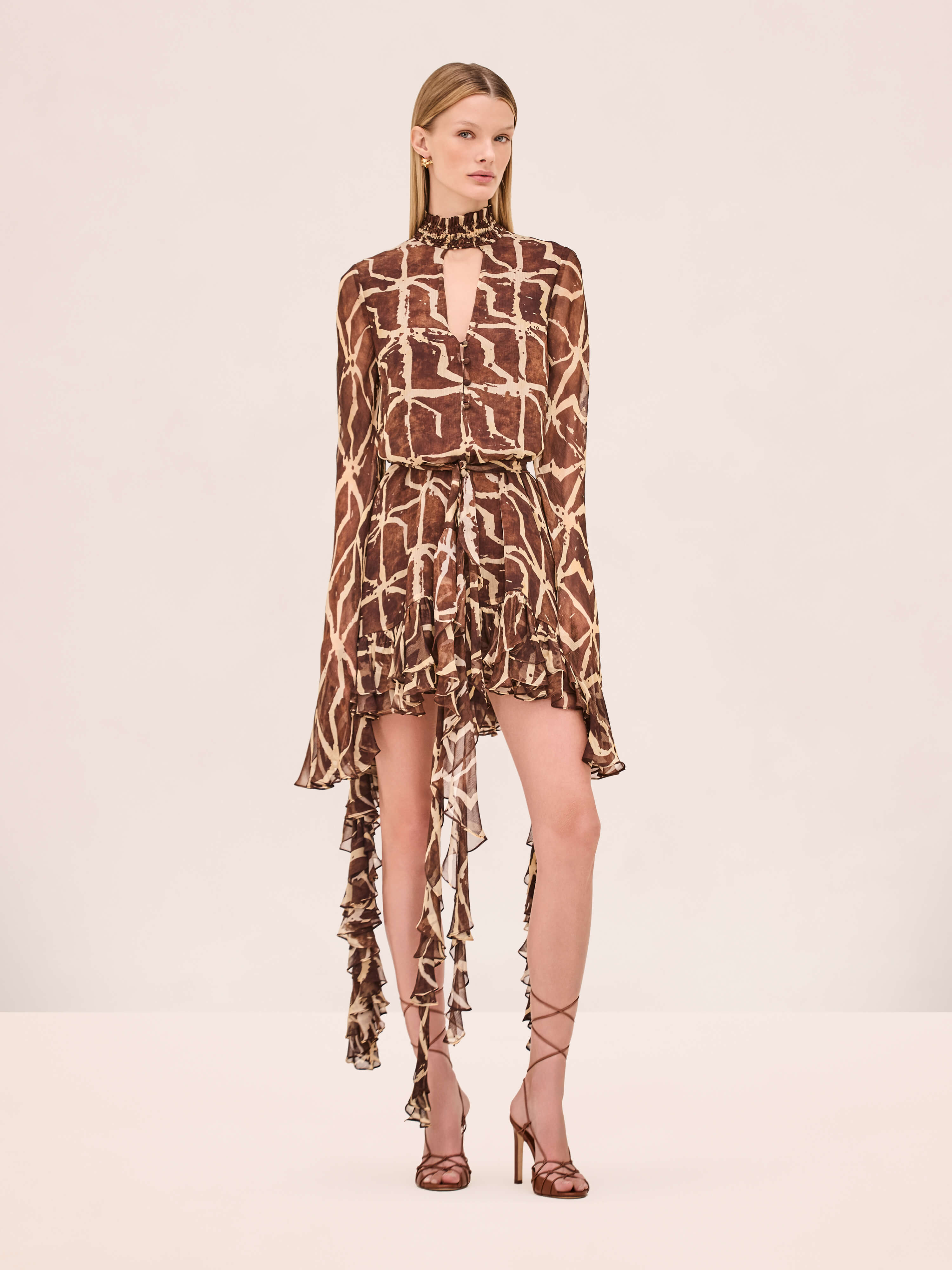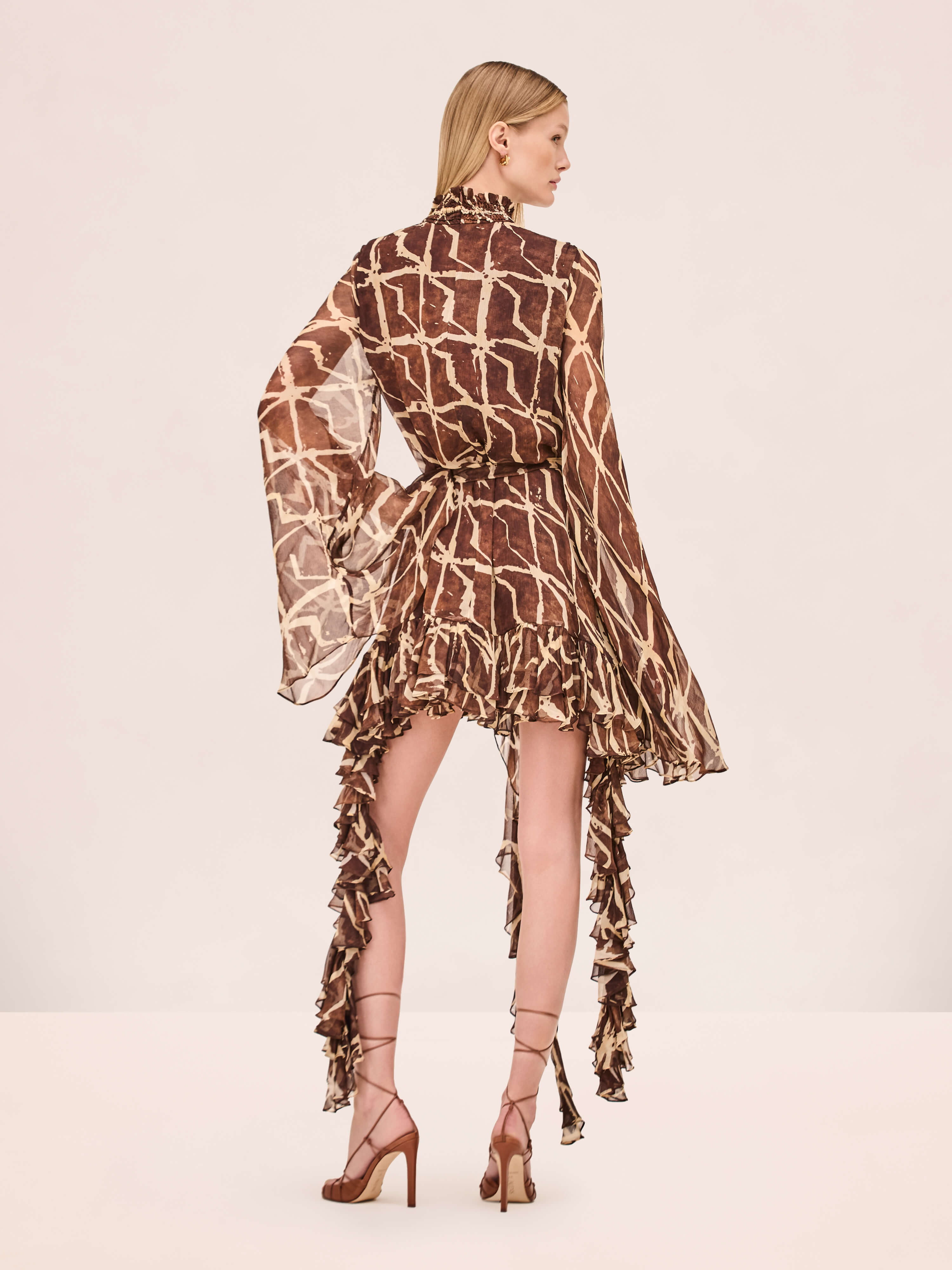 The Amalia Dress is a long sleeve mini silhouette featuring a tie waist, ruffle detailing, and an abstract print.