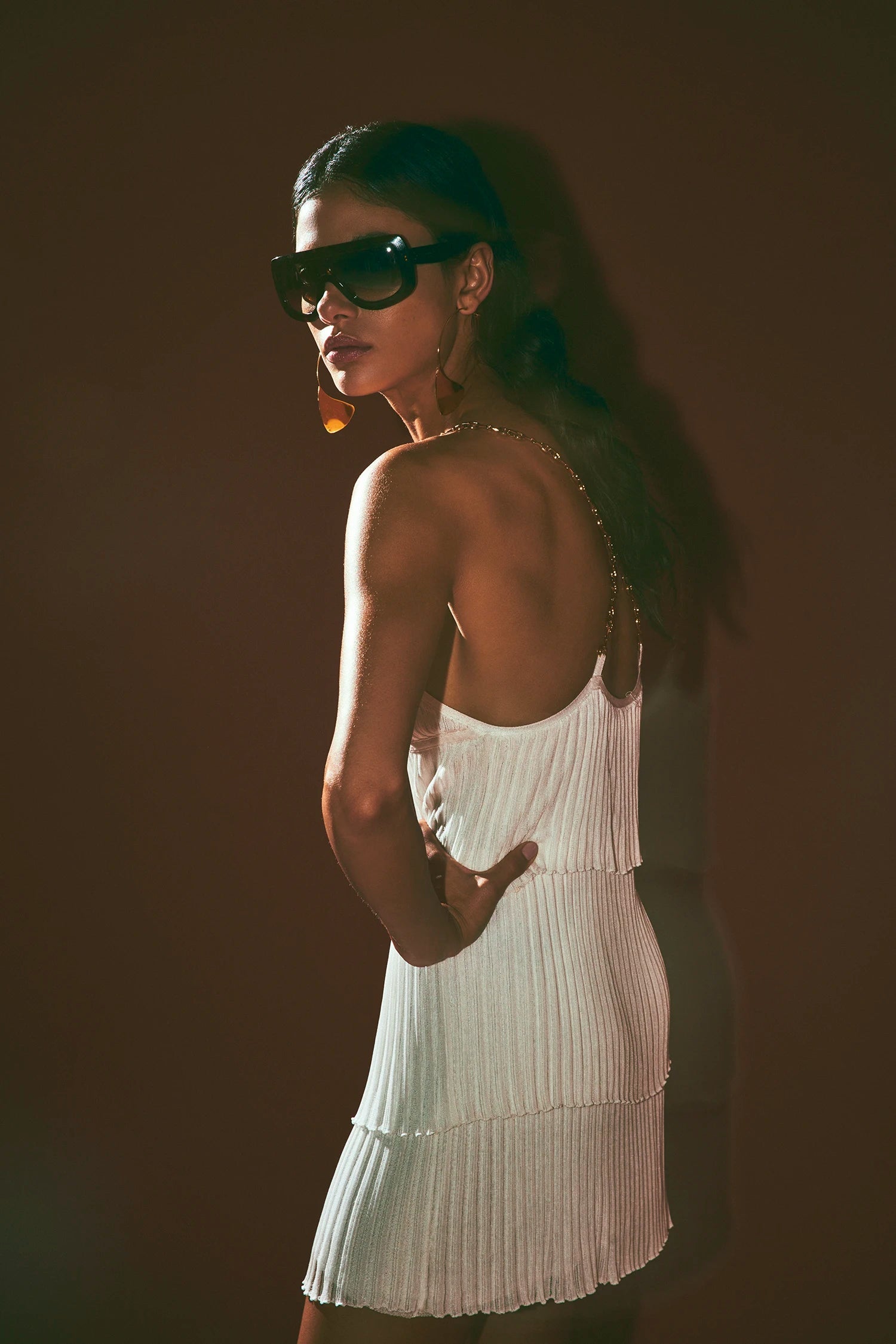 Introducing the Brunia Dress, an elegant and easy-to-wear blend of style. This tiered mini dress features delicate pleats that add a flowy touch, making it perfect for any event. The gold chain straps add a hint of luxury, while the minimalist design allows for effortless styling. Pair it with bold accessories or keep it simple for a classic and chic outfit.
