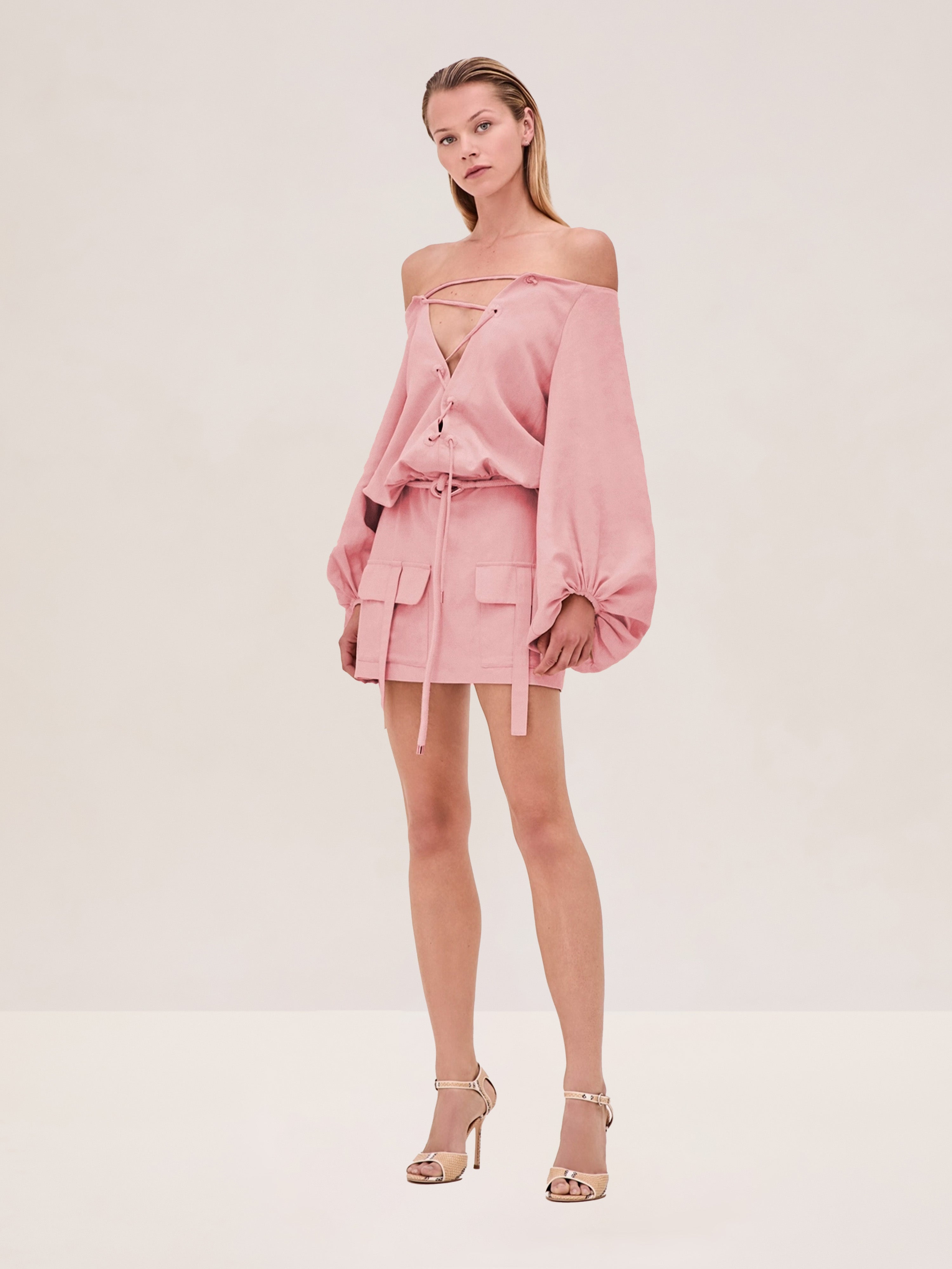 The Dillon Dress is a relaxed satin-blend mini with an adjustable off-the-shoulder neckline featuring lace-up detailing at the front, voluminous sleeves, and a decorative woven belt.