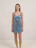 The Kacen Dress is a mini dress crafted in suede with contrast leather buckle straps and a belted waist.