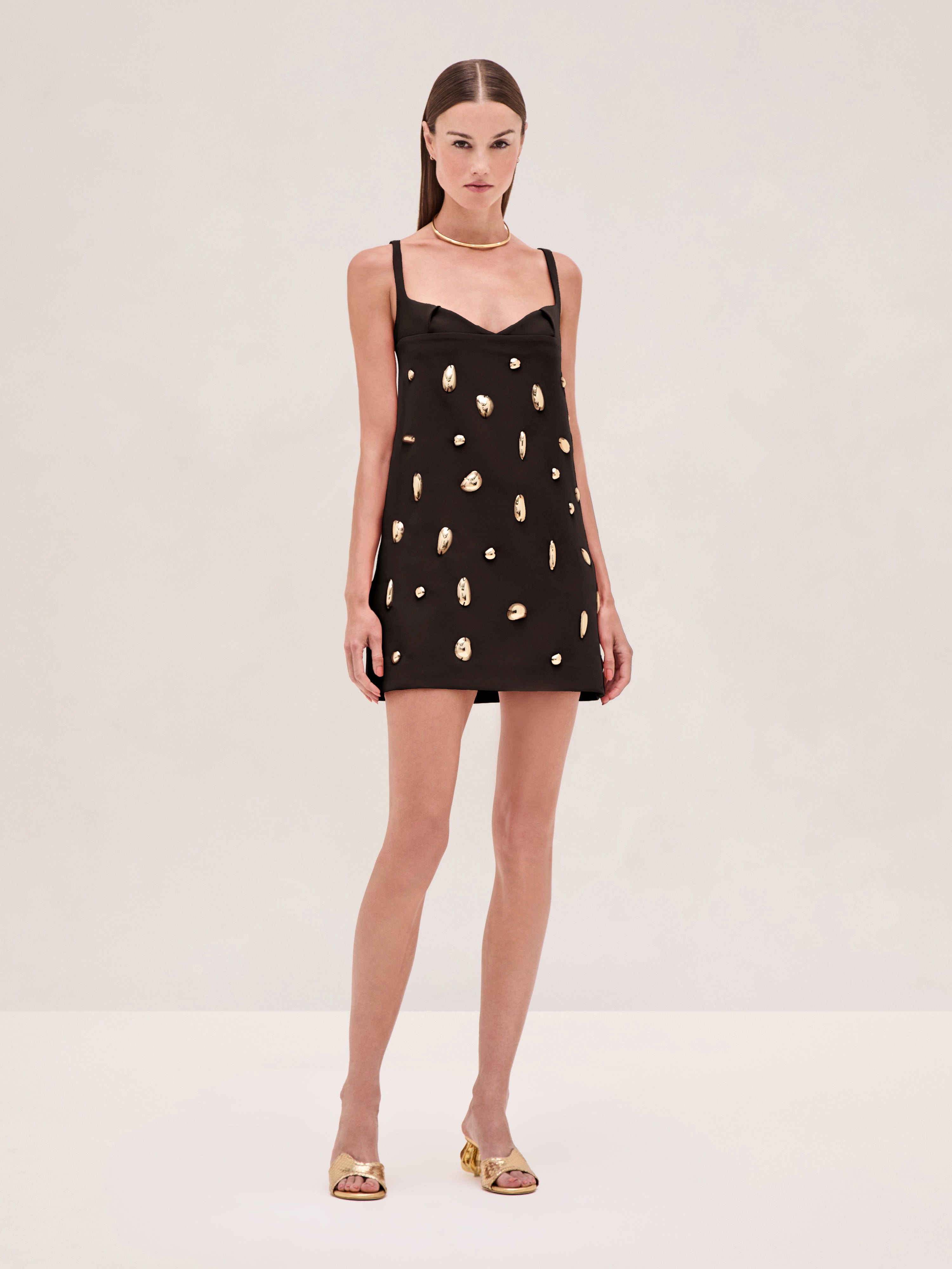 The Larsen Dress is a crepe A-line mini dress with gold hand-sewn appliqués.