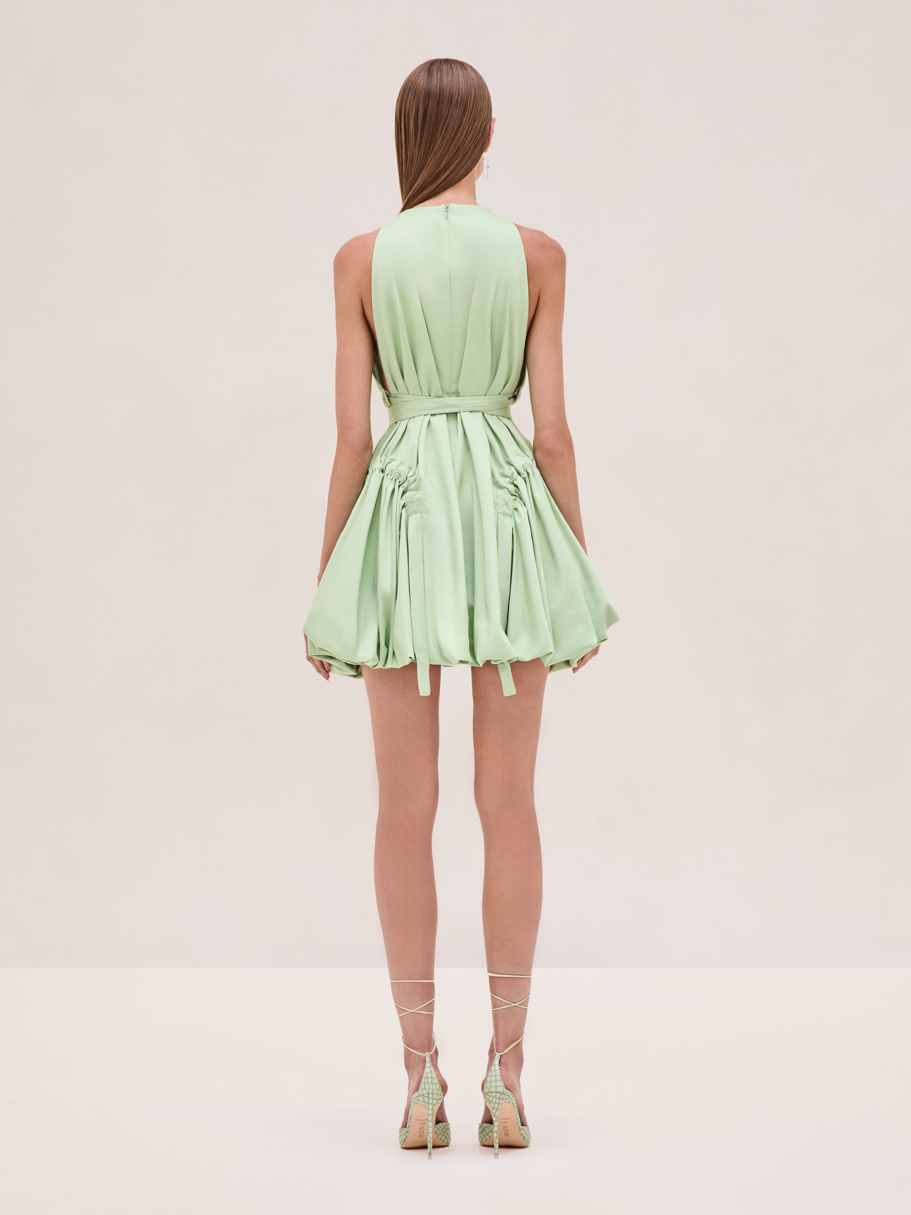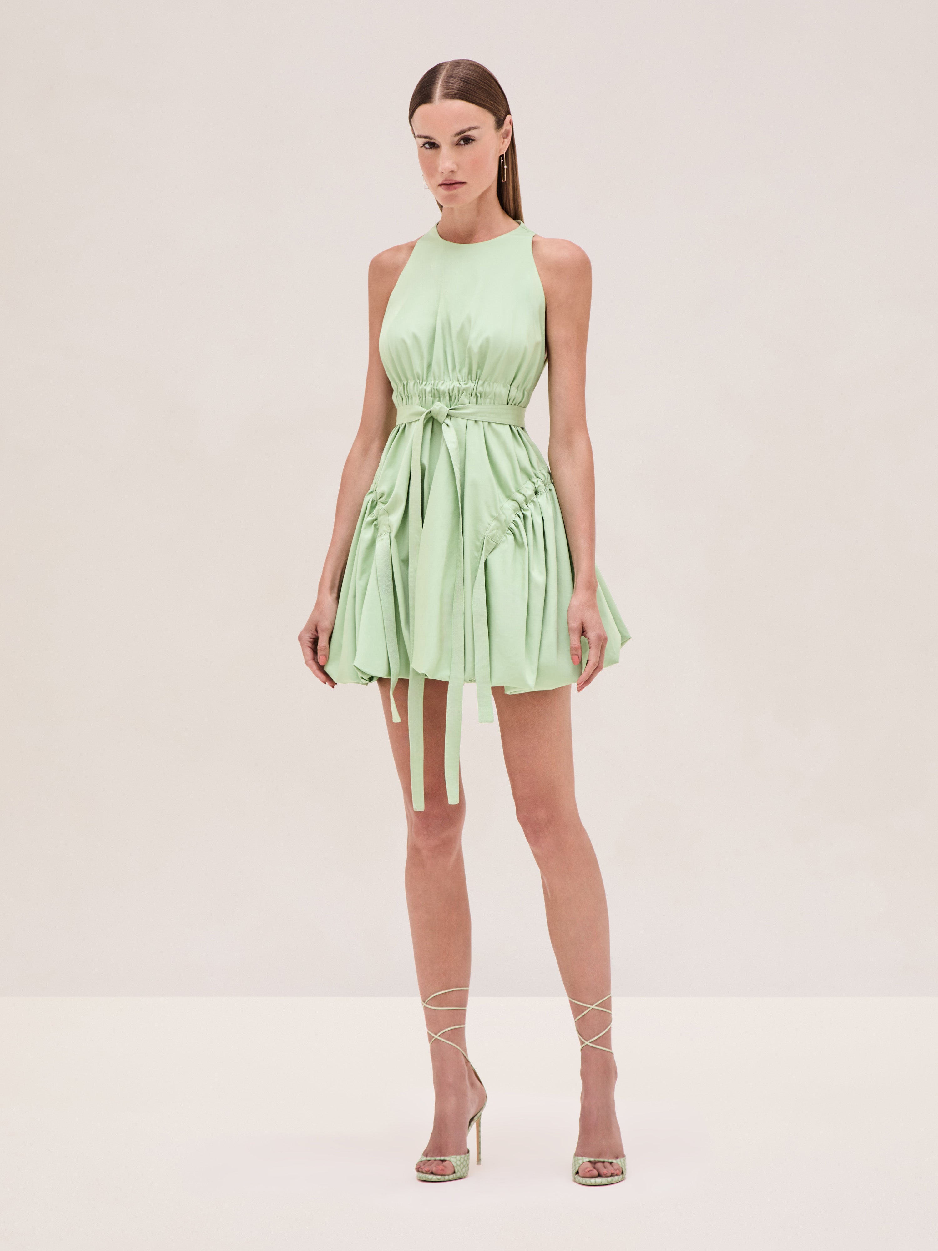 The Lidiane Dress is a mini dress with a cinched waist and delicate tie detailing.