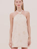 The Milaa Dress is a halter mini silhouette featuring 3D floral appliqués throughout.