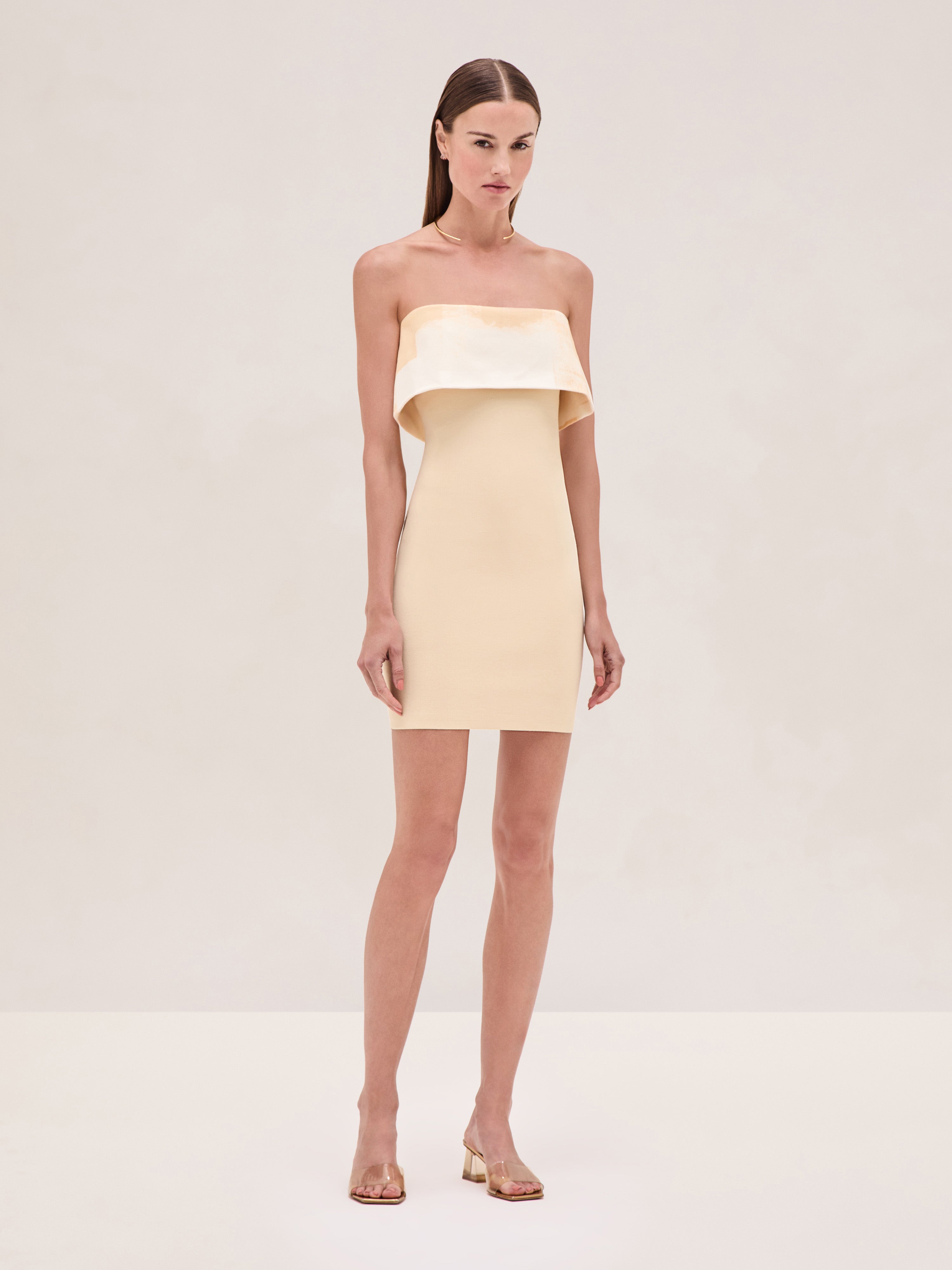 The Nava Dress is a strapless ribbed knit mini dress with a printed overlay at the top, finished with a fitted silhouette.