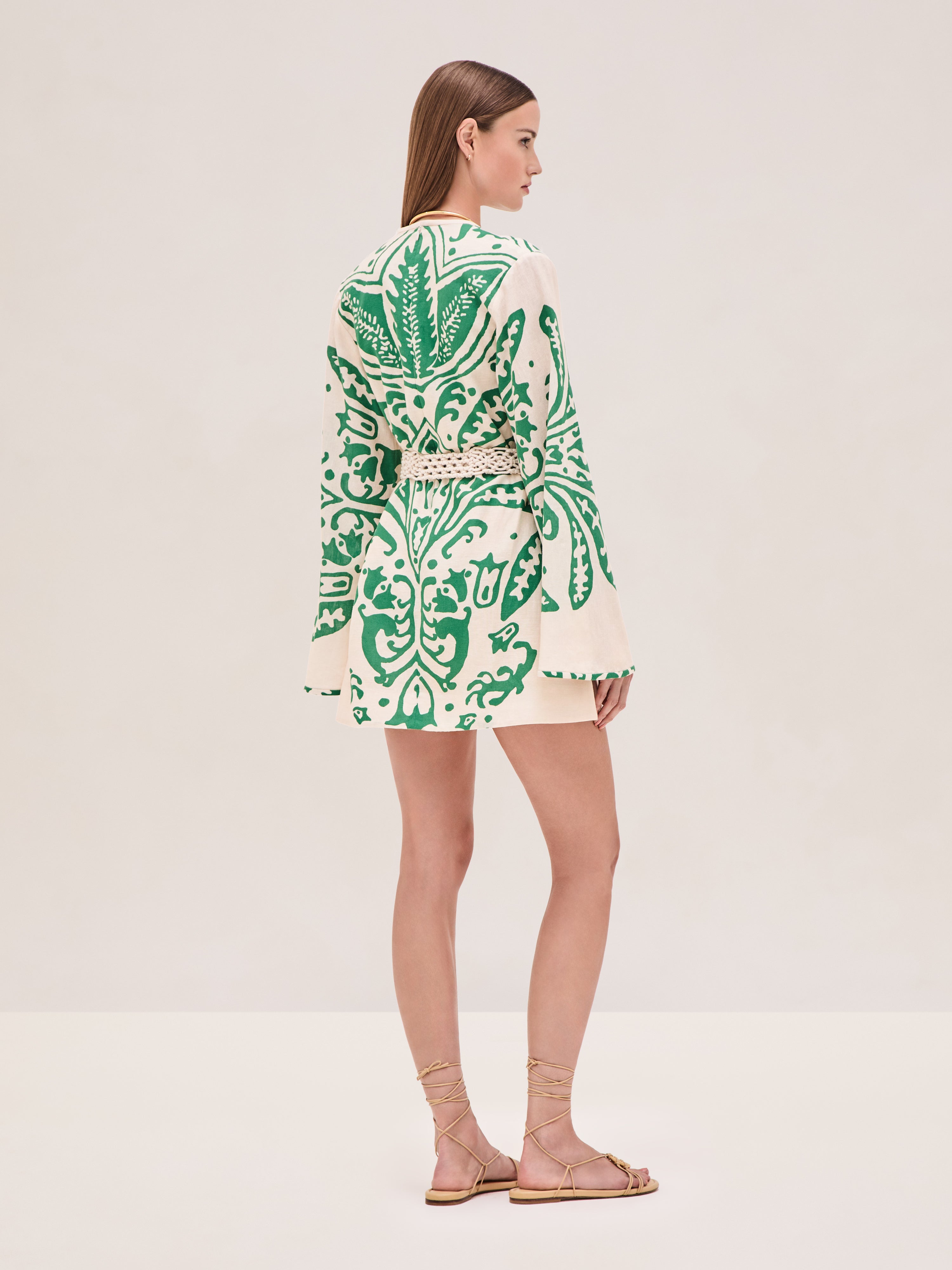 The Noriko Dress is a cotton-linen blend tunic dress featuring a removable macrame belt.