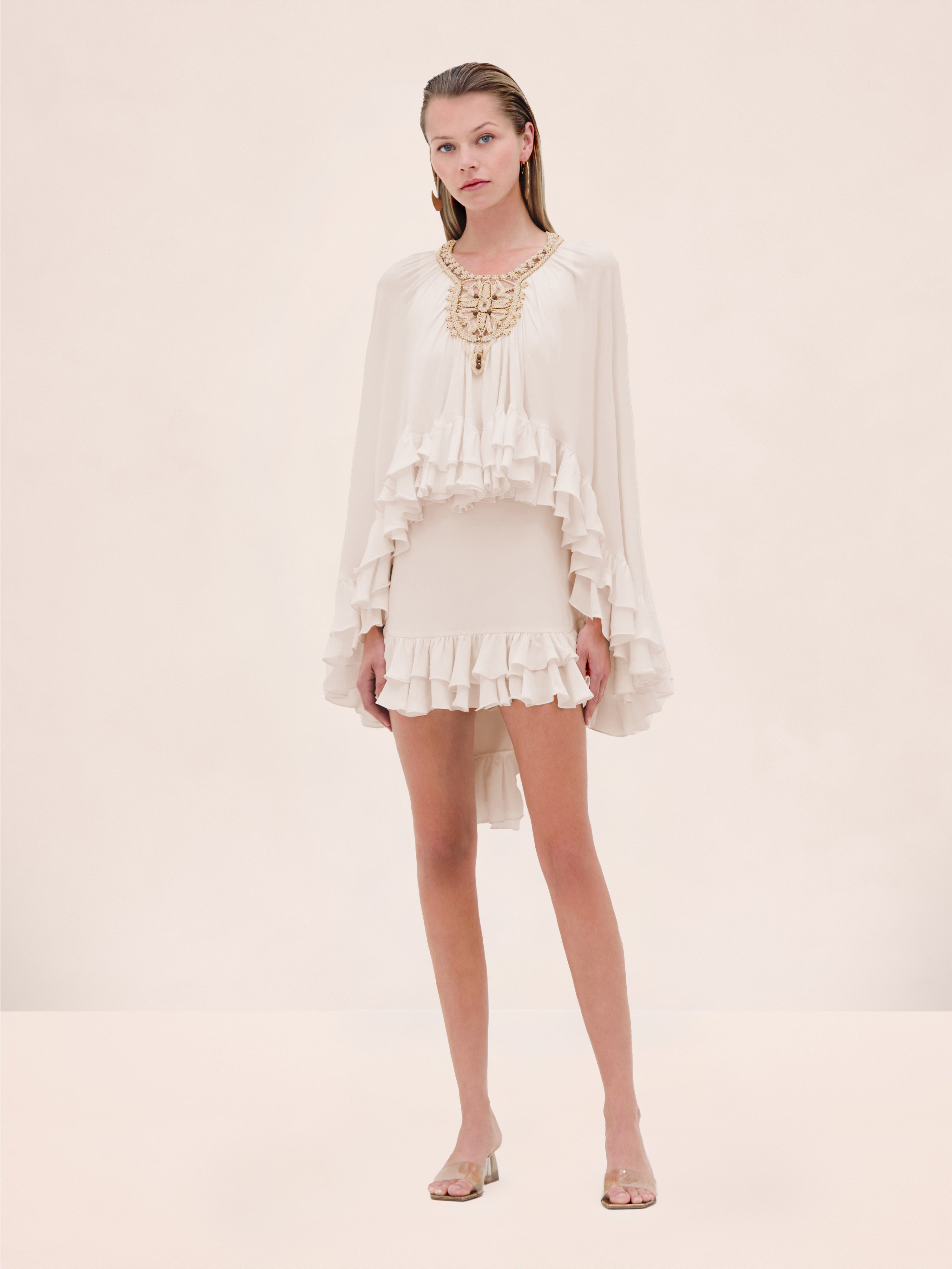 The Taessa Dress is a fluid crepe mini dress with a soft drape and ruffled hem, finished with a hand-beaded necklace at the neckline.