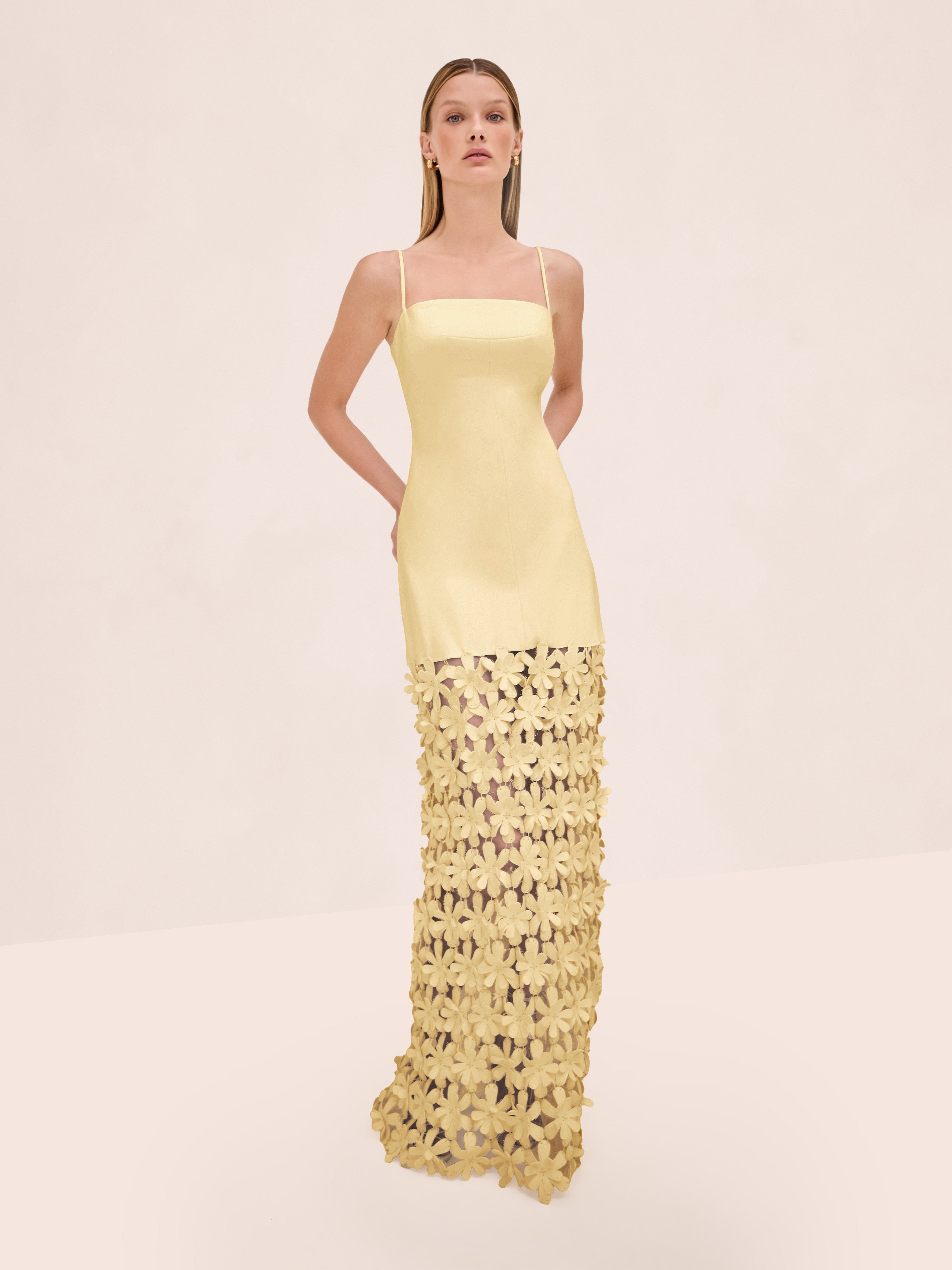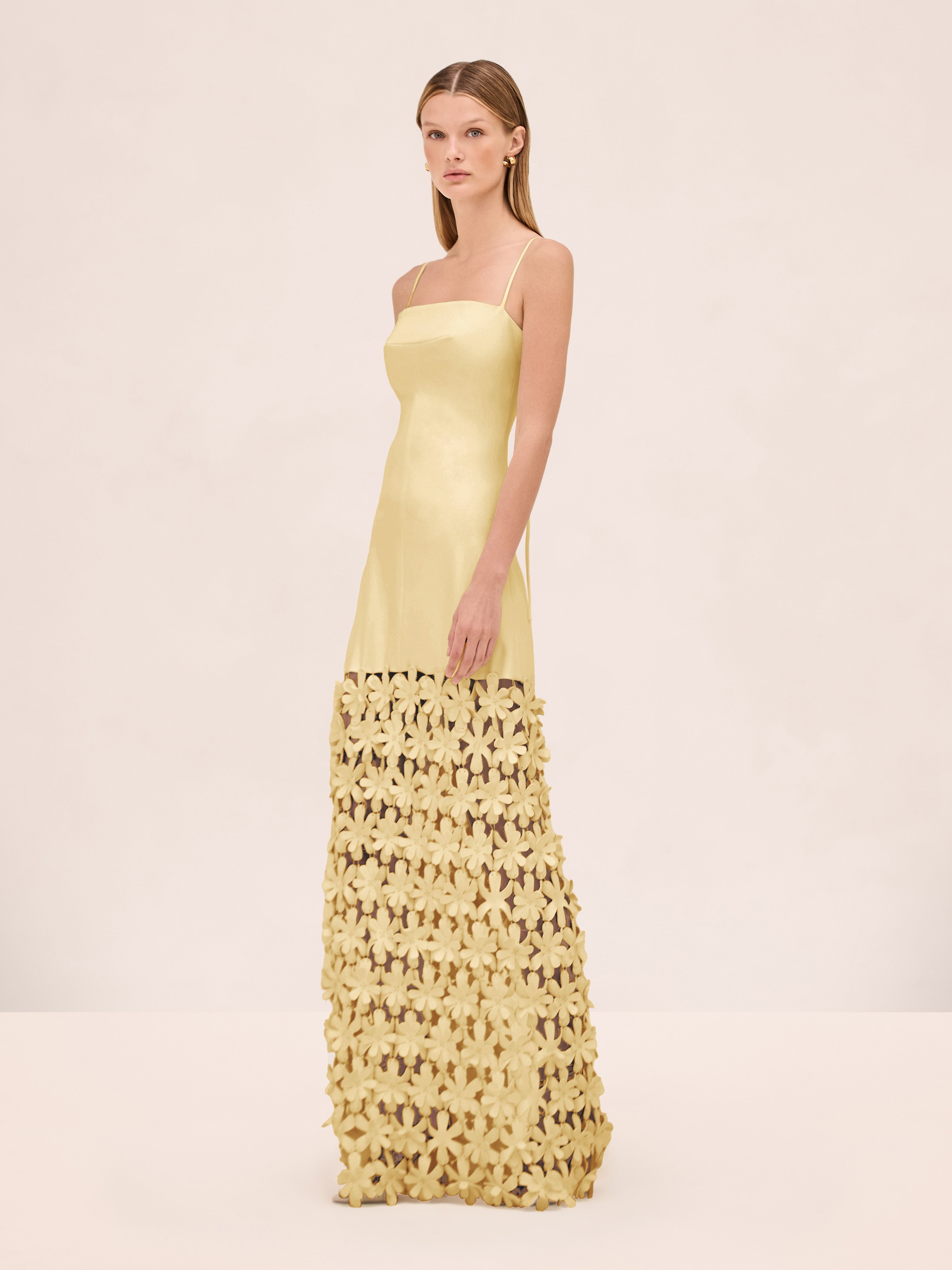 The Magdalena Dress is a fitted silhouette featuring a sheer cutout skirt with 3D floral appliqués.