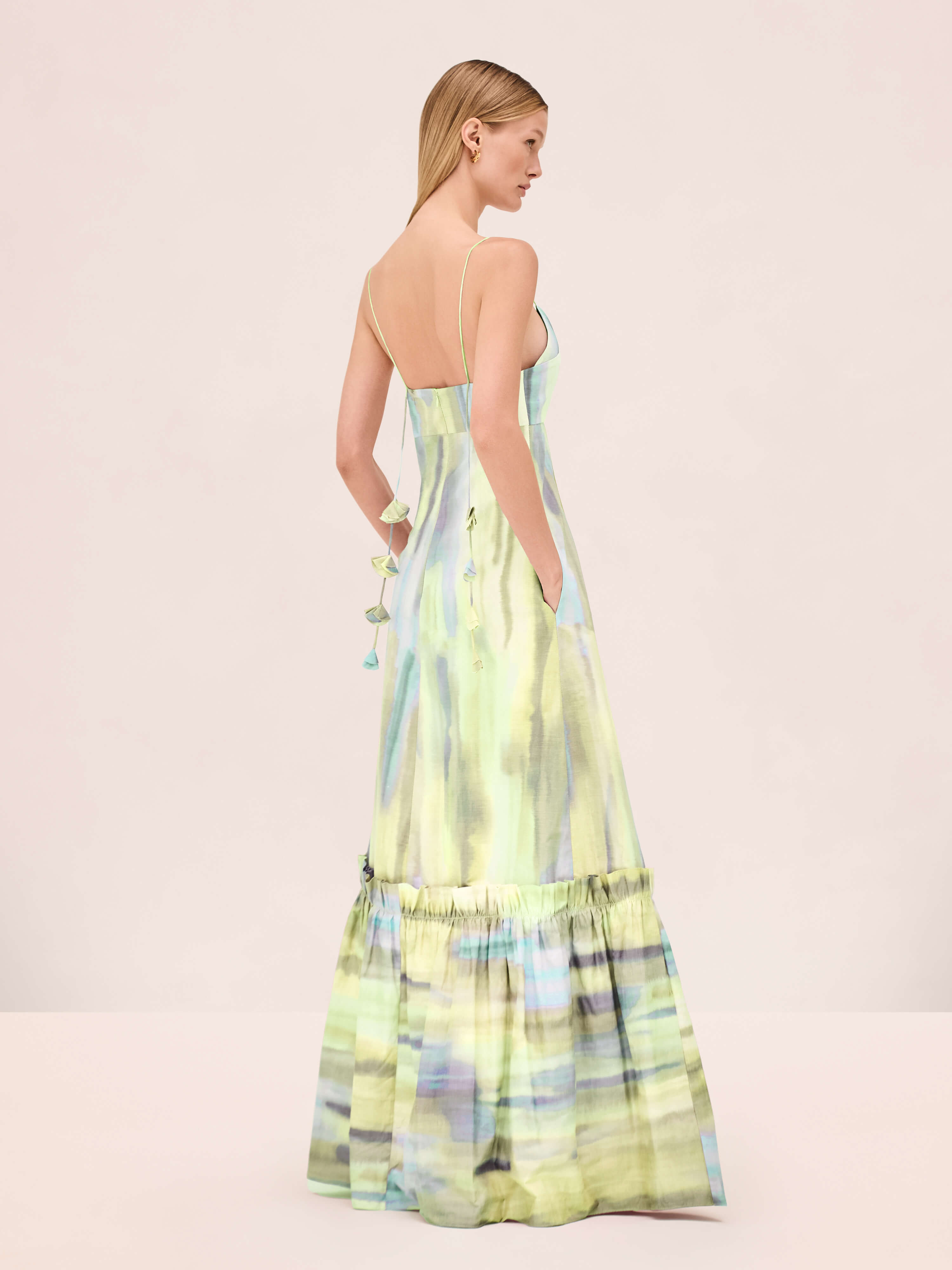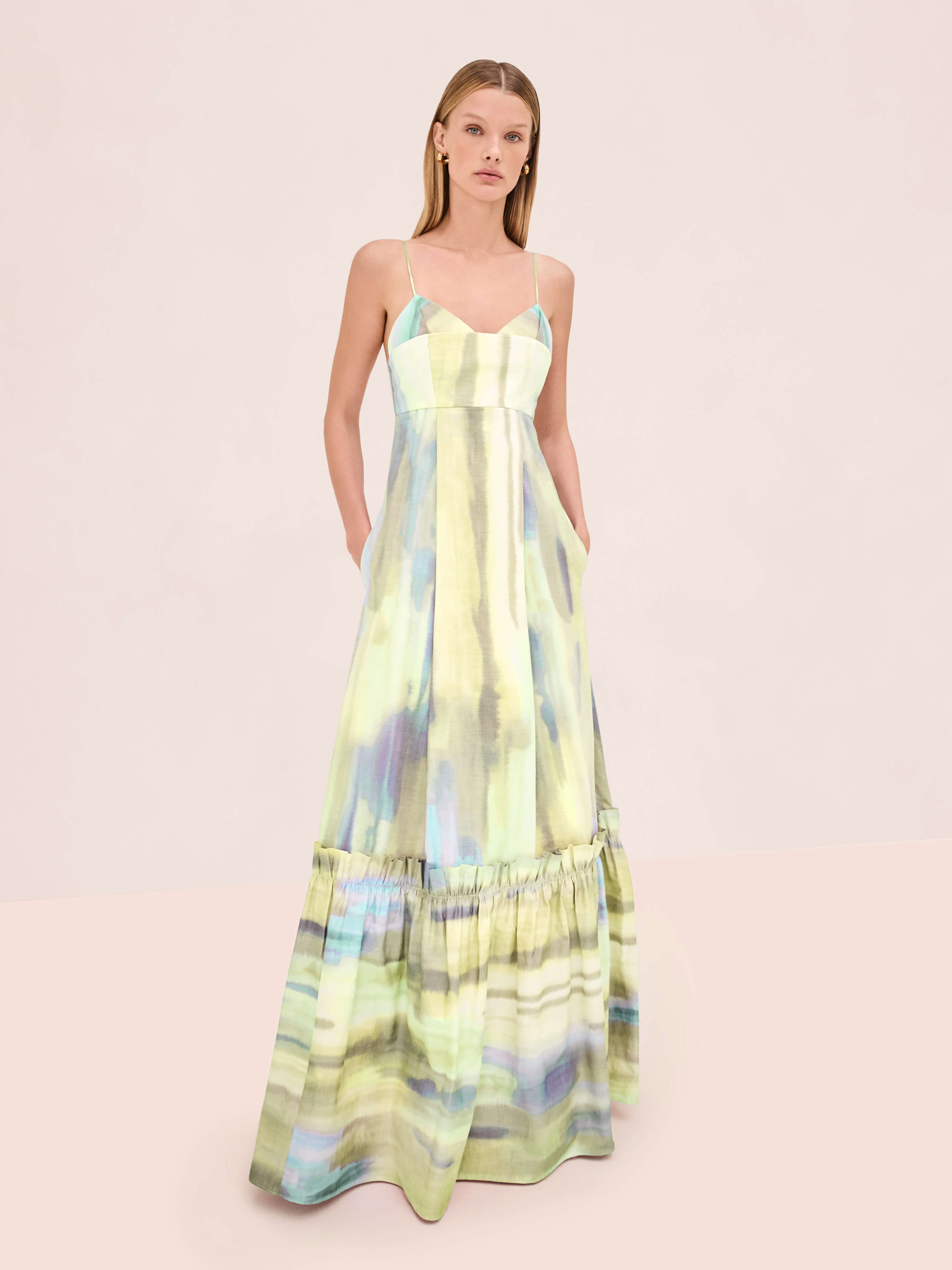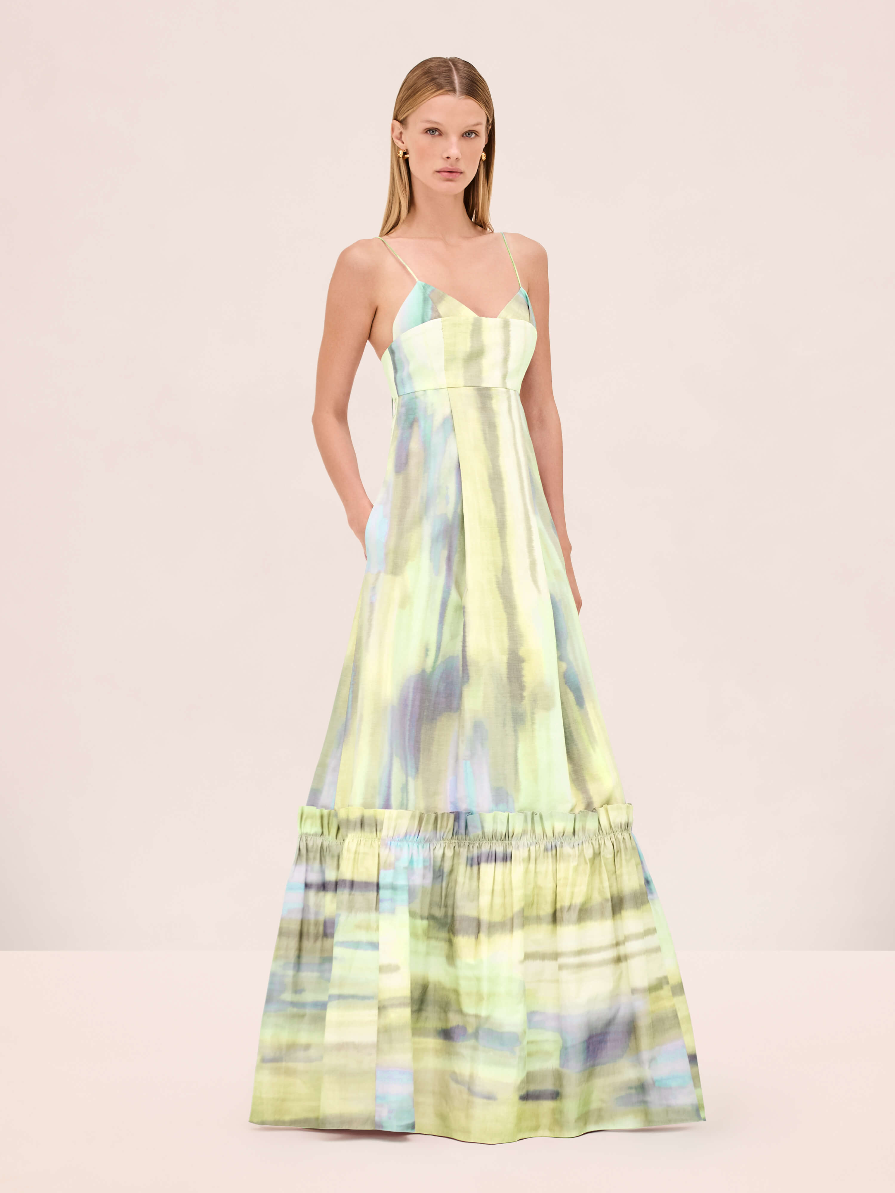 The Danelle Dress is a spaghetti strap silhouette featuring a ruched hem and watercolor-inspired print.