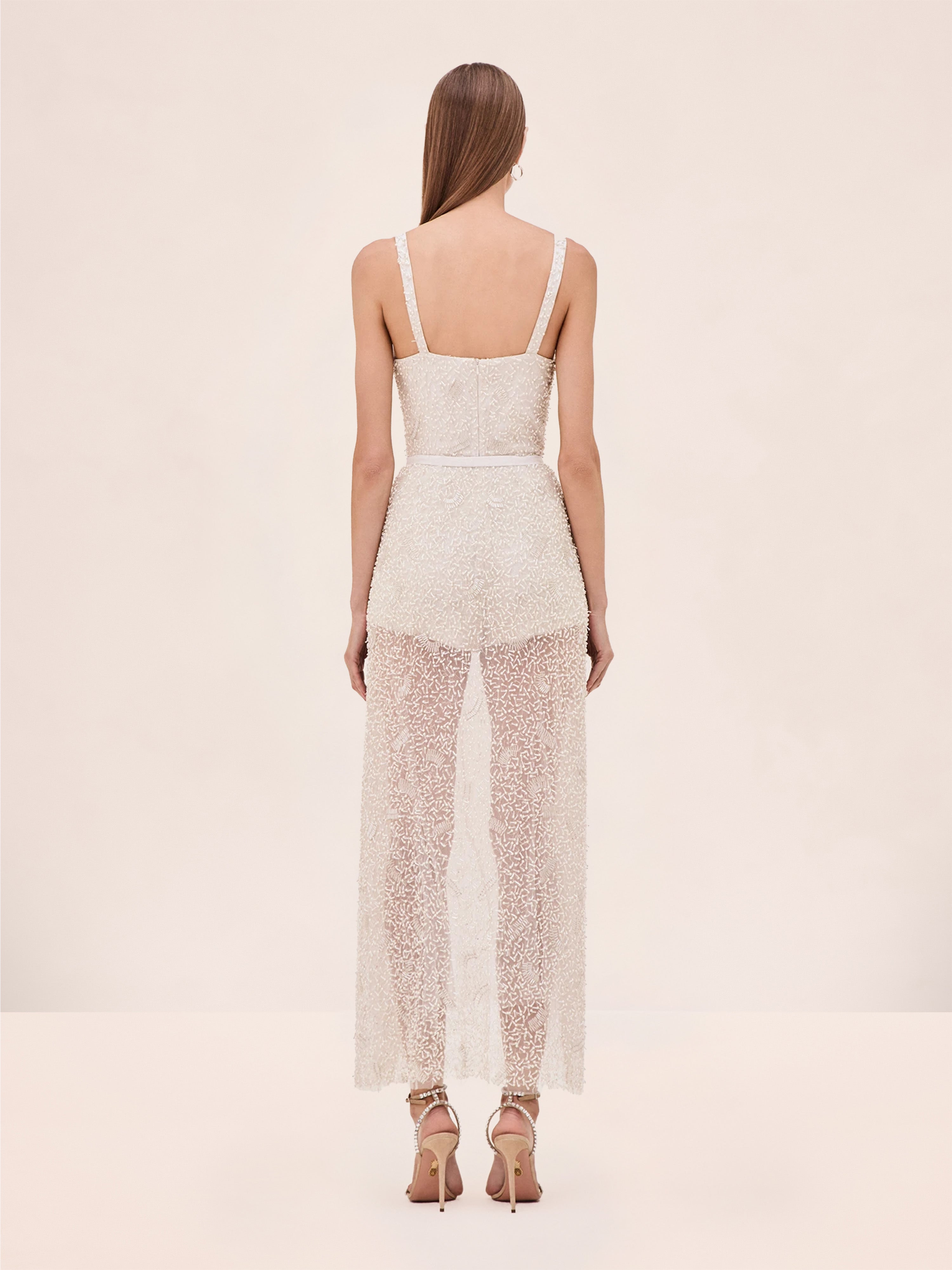Intricately adorned with shimmering beads, the Escola Romper offers a modern twist on classic silhouette. The structured bodice flatters your silhouette while the detachable skirt adds a dramatic layer of elegance. Perfect for making a statement, wear it with or without the cape for a versatile and show-stopping ensemble.