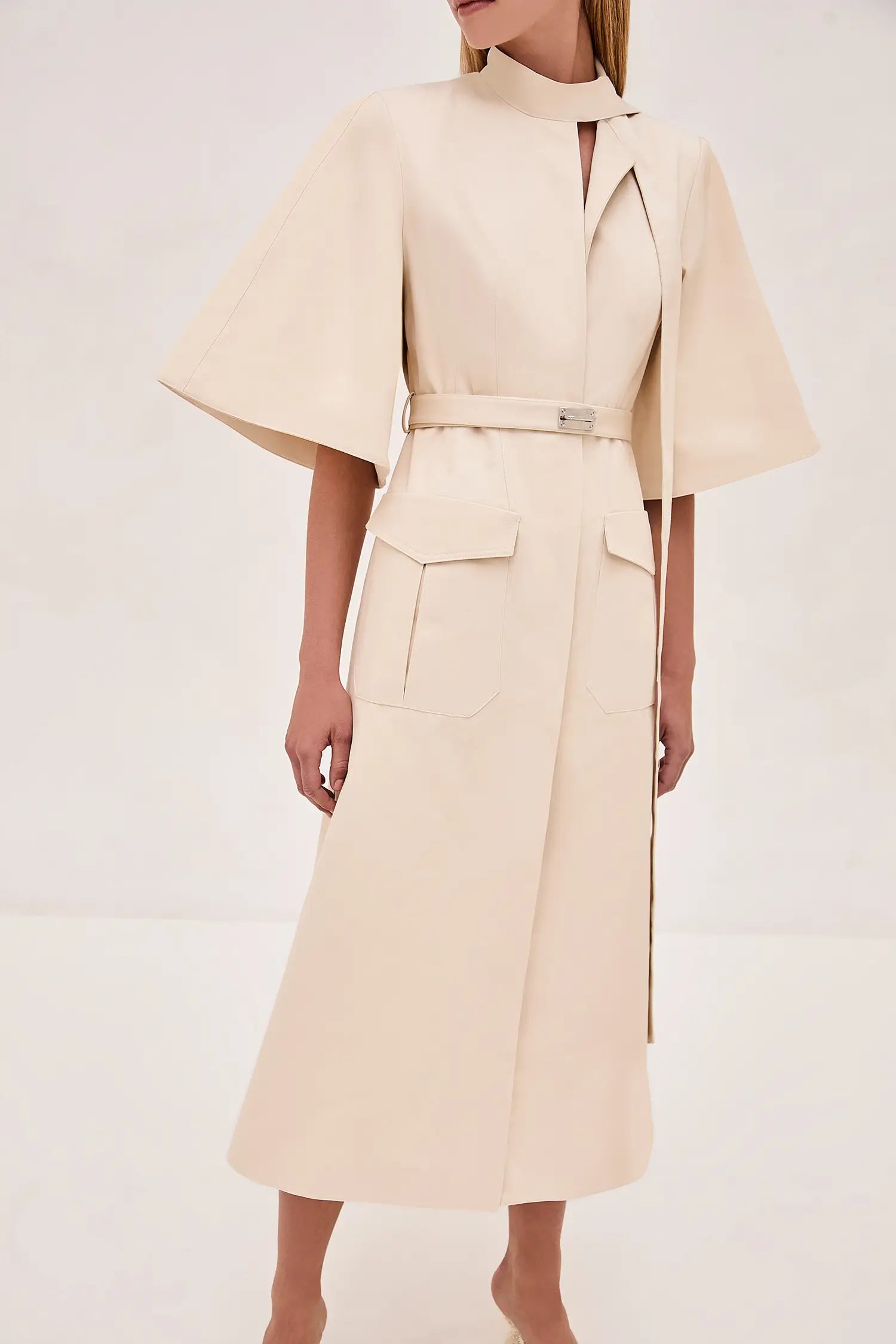 The Ilardi Midi Dress combines structured tailoring with feminine sophistication. Featuring a sharp collar and flared sleeves, it’s designed for a polished, contemporary look. A belted waist with a sleek metal buckle creates a flattering silhouette, while extended neck ties and functional front pockets add versatility and practicality.